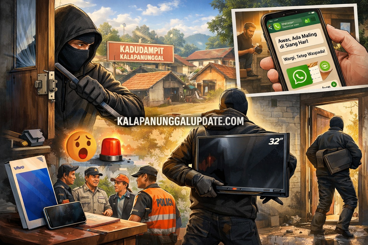 KALAPANUNGGALUPDATE.COM, KADUDAMPIT Kalapanunggal. — ( 5/1/2026 ). Aksi pencurian kembali meresahkan warga. Kali ini, sebuah rumah warga di wilayah Kadudampit, Kecamatan Kalapanunggal, menjadi sasaran maling yang beraksi pada siang hari, saat rumah dalam kondisi ditinggal pemiliknya.