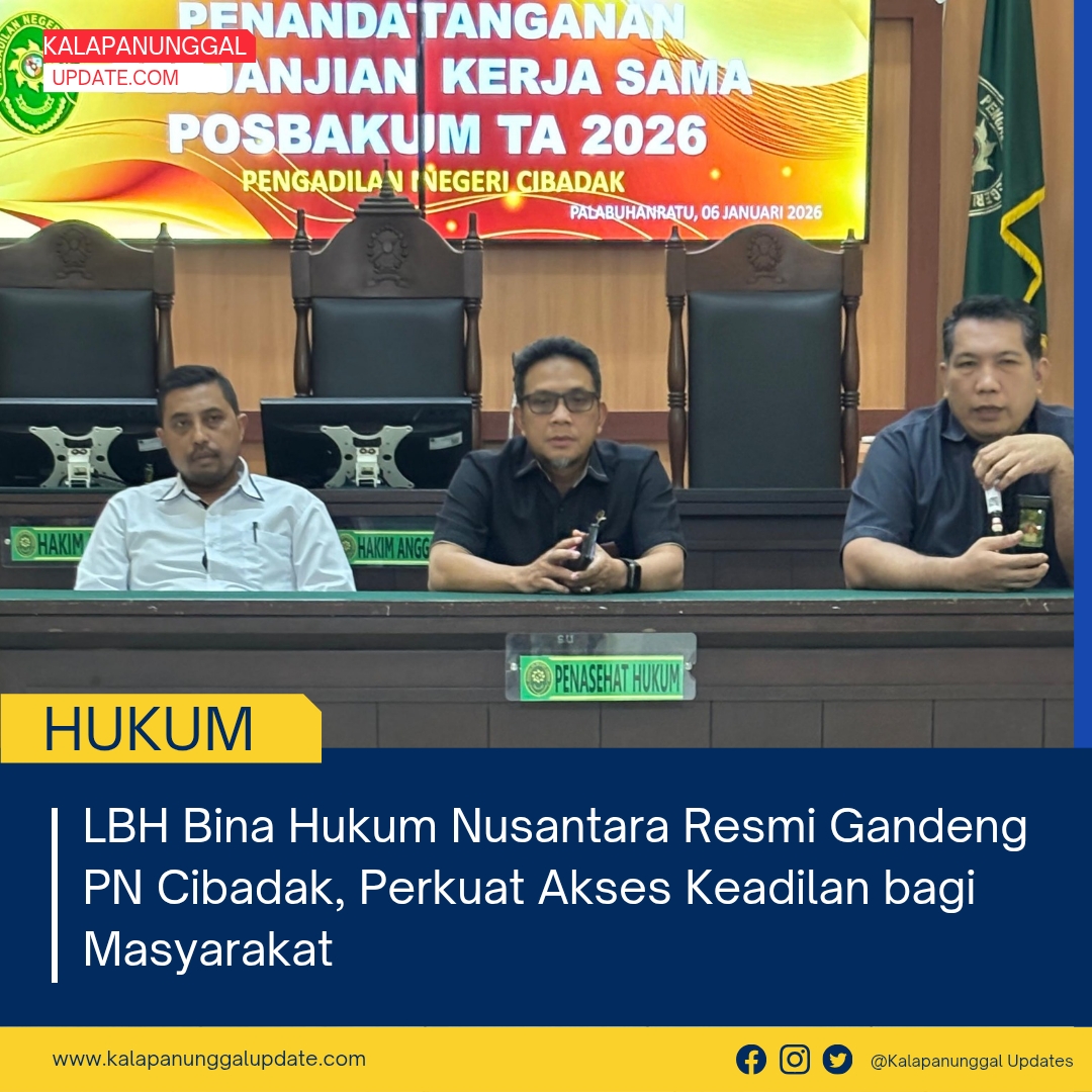 KALAPANUNGGALUPDATE.COM, Pengadilan Negeri Cibadak. – ( 6/1/2026 ). Komitmen memperluas akses keadilan bagi masyarakat kembali ditegaskan melalui penandatanganan Nota Kesepahaman (MoU) antara Lembaga Bantuan Hukum (LBH) Bina Hukum Nusantara dengan Pengadilan Negeri Cibadak Kelas IB. Kerja sama ini menetapkan LBH Bina Hukum Nusantara sebagai penyedia layanan Pos Bantuan Hukum (Posbakum) bagi para pencari keadilan di wilayah hukum Pengadilan Negeri Cibadak.