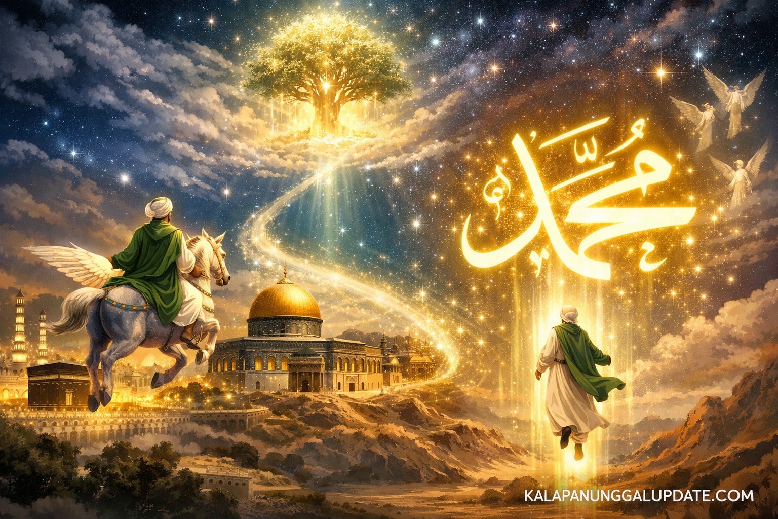 KALAPANUNGGALUPDATE. — ( 7/1/2026 ). Peristiwa Isra Mi’raj Nabi Muhammad SAW merupakan salah satu kejadian paling agung dan monumental dalam sejarah Islam. Perjalanan luar biasa yang terjadi dalam satu malam ini bukan sekadar mukjizat, melainkan memiliki sebab-sebab mendalam yang sarat ujian, hikmah, serta penguatan iman bagi Rasulullah SAW dan umatnya.