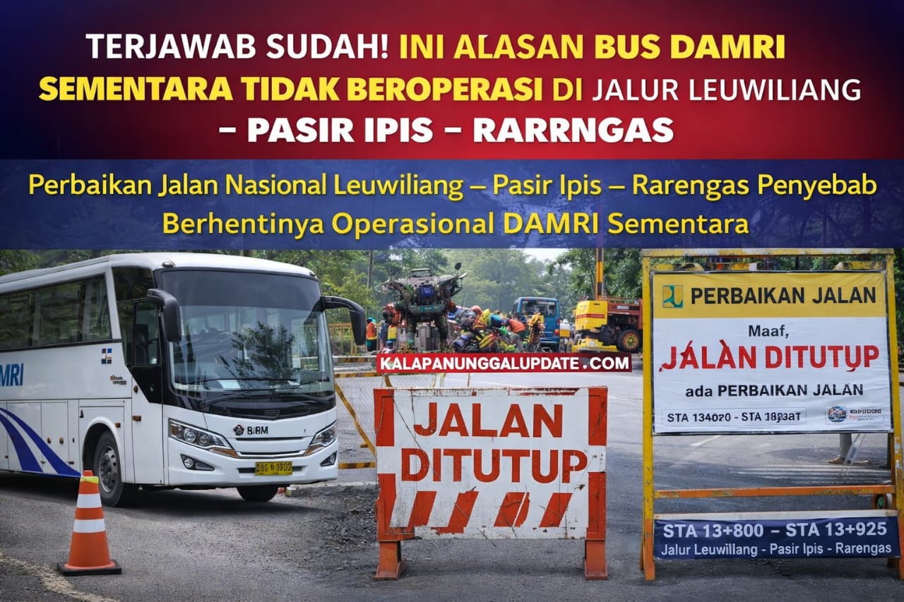 KALAPANUNGGALUPDATE.COM, – ( 7/1/2026 ) . Kebingungan warga akhirnya terjawab. Berhentinya sementara operasional kendaraan bus DAMRI di jalur Leuwiliang – Pasir Ipis – Rarengas bukan tanpa sebab. Hal tersebut terjadi menyusul adanya penutupan jalan nasional sementara untuk kepentingan pekerjaan peningkatan infrastruktur jalan.