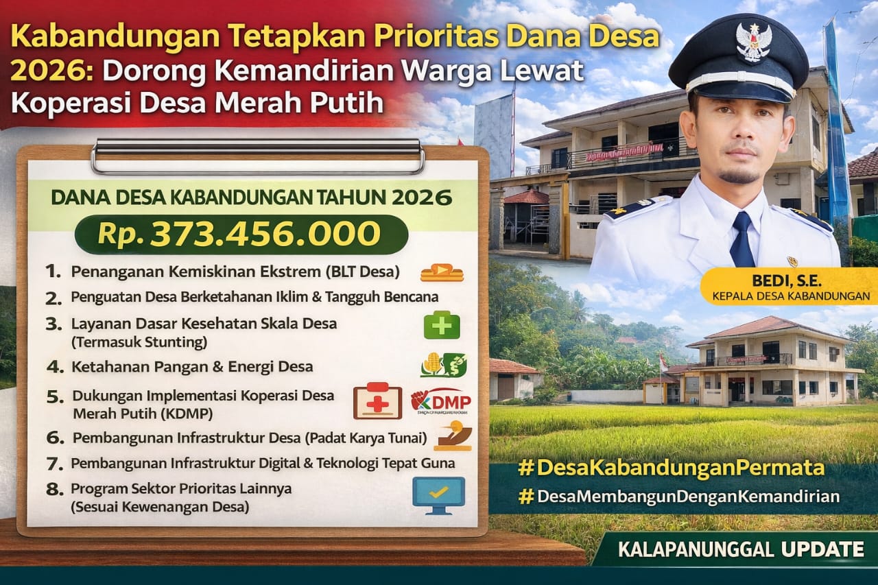 KALAPANUNGGALUPDATE.COM, Kabandungan. — ( 10/1/2026 ). Pemerintah Desa Kabandungan, Kecamatan Kabandungan, Kabupaten Sukabumi, Provinsi Jawa Barat, resmi mengumumkan rencana penggunaan Dana Desa Tahun 2026. Total anggaran yang akan dikelola desa pada tahun 2026 mencapai Rp 373.456.000. Dana tersebut akan difokuskan pada program-program prioritas sesuai dengan Peraturan Menteri Desa dan Pembangunan Daerah Tertinggal Republik Indonesia Nomor 16 Tahun 2025.