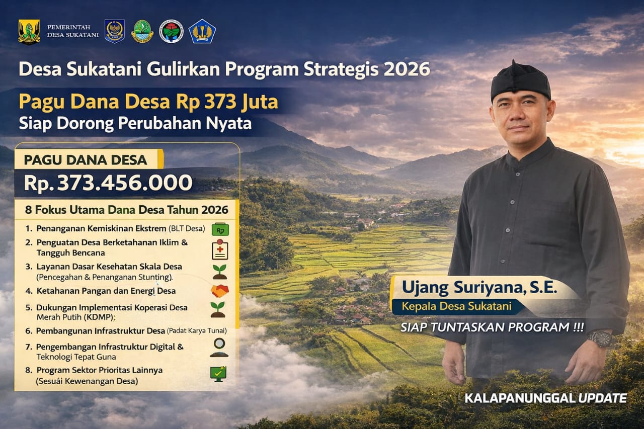 KALAPANUNGGALUPDATE.COM, KABUPATEN SUKABUMI. Desa Sukatani, – ( 10/1/2026 ). Pemerintah Desa Sukatani, Kabupaten Sukabumi, Jawa Barat, resmi mengumumkan pagu Dana Desa Reguler tahun 2026 sebesar Rp 373.456.000. Anggaran tersebut akan difokuskan pada delapan program prioritas yang dinilai langsung menyentuh kebutuhan masyarakat, mulai dari penanganan kemiskinan hingga penguatan ketahanan pangan desa.