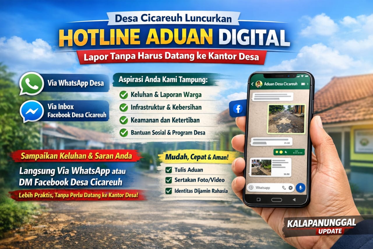 KALAPANUNGGALUPDATE.COM, Desa Cicareuh, Kecamatan Cikidang, — ( 12/1/2026 ). Dalam upaya meningkatkan kualitas pelayanan publik serta memperkuat komunikasi dengan masyarakat, Pemerintah Desa Cicareuh resmi membuka Hotline Aduan dan Usulan Digital. Kini, warga dapat menyampaikan keluhan, laporan, serta saran langsung kepada pemerintah desa hanya melalui WhatsApp atau inbox media sosial Facebook Desa Cicareuh, tanpa perlu datang ke kantor desa.