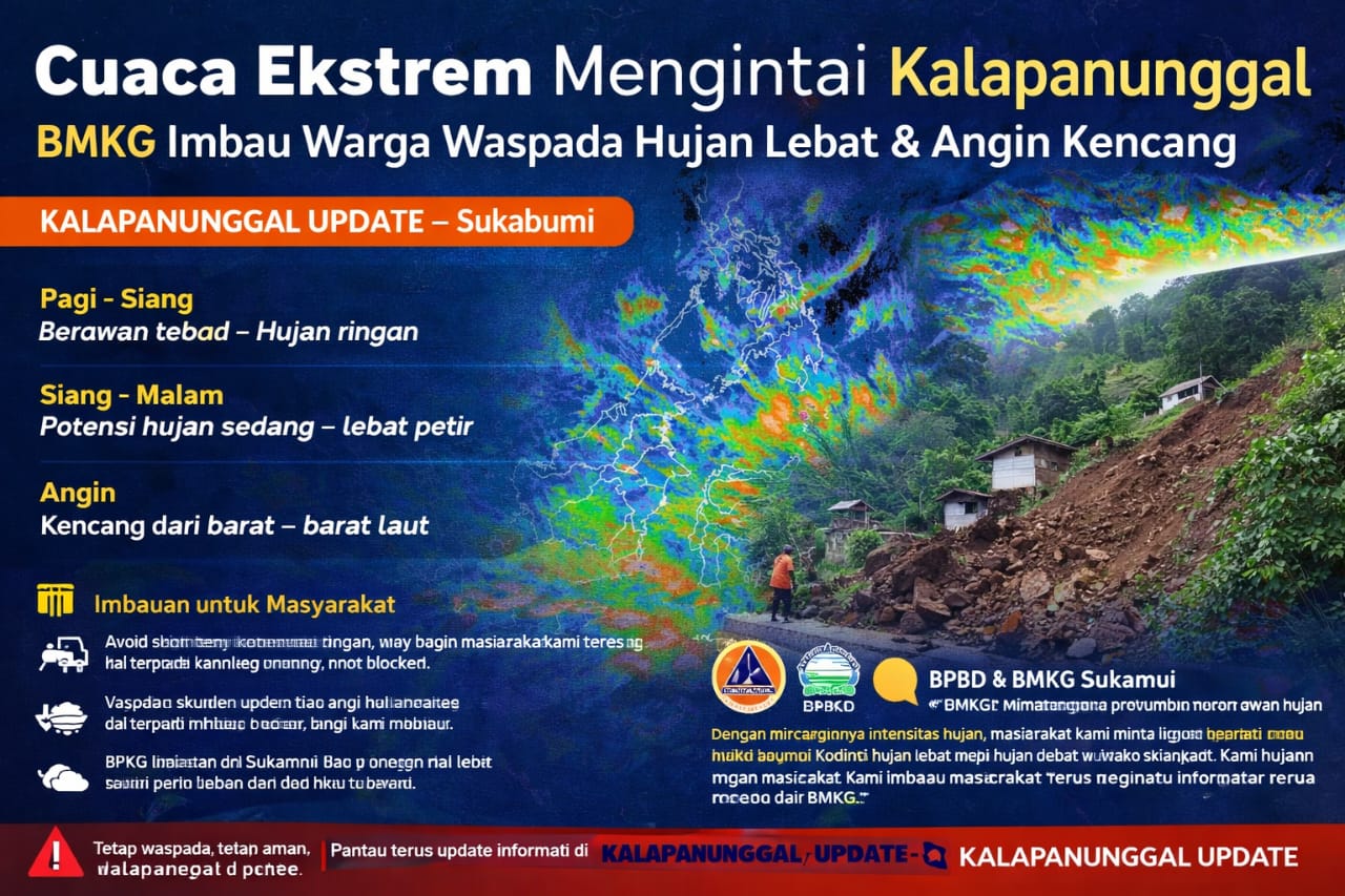 KALAPANUNGGALUPDATE.COM, Kecamatan Kalapanunggal, Kabupaten Sukabumi, – ( 12/1/2026 ). Masyarakat Kecamatan Kalapanunggal, Kabupaten Sukabumi, diminta meningkatkan kewaspadaan terhadap potensi cuaca ekstrem pada hari ini. Berdasarkan pantauan citra satelit Himawari-9 BMKG, terpantau pertumbuhan awan konvektif tebal yang cukup signifikan di wilayah Jawa Barat bagian selatan, termasuk Sukabumi dan sekitarnya.