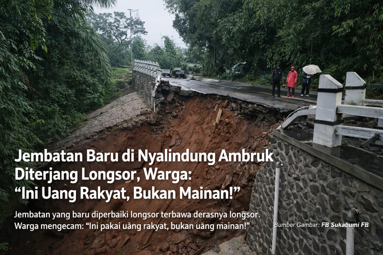 KALAPANUNGGALUPDATE.COM, Kecamatan Nyalindung, Kabupaten Sukabumi, — ( 12/1/2026 ). Hujan deras yang mengguyur wilayah Nyalindung kembali memicu bencana longsor. Kali ini, bukan hanya tanah yang runtuh, tetapi juga jembatan yang baru saja selesai dibangun ikut tergerus dan ambruk, memutus akses utama warga.