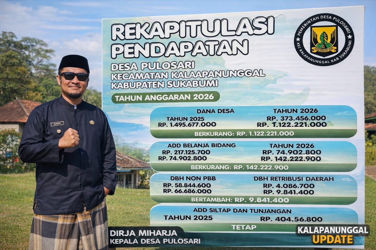 KALAPANUNGGALUPDATE.COM, Desa Pulosari, kecamatan Kalapanunggal. – Pemerintah Desa Pulosari, ( 13/1/2026 ). Kecamatan Kalapanunggal, Kabupaten Sukabumi, secara terbuka menyampaikan rekapitulasi pendapatan desa Tahun Anggaran 2026 sebagai bentuk transparansi dan akuntabilitas kepada masyarakat.