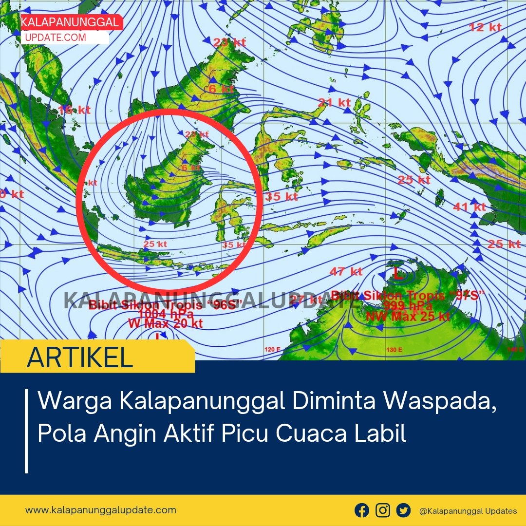Berdasarkan analisis tersebut, Kecamatan Kalapanunggal diperkirakan akan terdampak aliran angin monsun baratan dengan kecepatan bervariasi 20–30 knot, terutama pada siang hingga malam hari. Pola angin ini berpotensi memicu peningkatan pembentukan awan hujan, sehingga peluang hujan sedang hingga lebat disertai angin kencang sesaat dapat terjadi secara tidak merata.