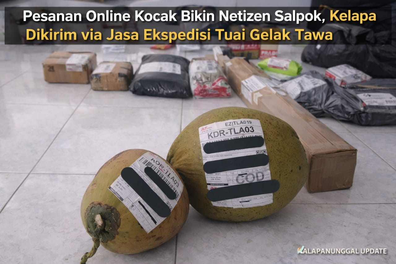 KALAPANUNGGALUPDATE.COM, – ( 19/1/2026 ). Media sosial kembali dihebohkan dengan sebuah unggahan unik yang memperlihatkan pesanan online tak biasa. Dalam foto yang beredar luas, tampak dua butir kelapa utuh ditempeli label pengiriman jasa ekspedisi lengkap dengan kode resi dan sistem COD (Cash On Delivery), seolah menjadi paket belanja online pada umumnya.