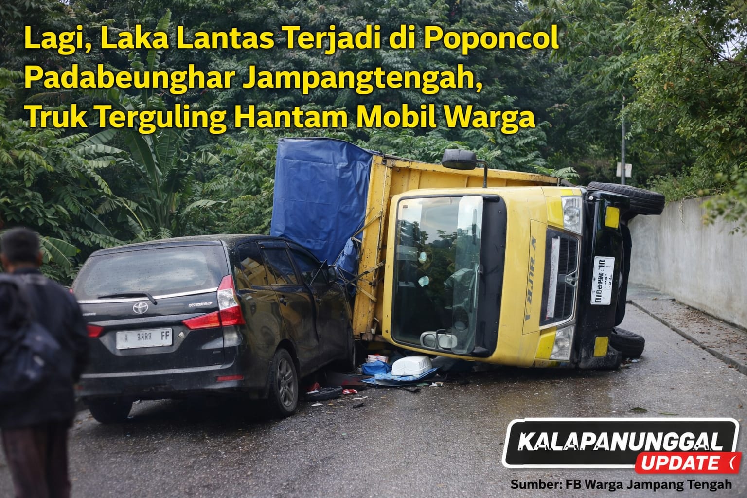 KALAPANUNGGALUPDATE.COM, JAMPANGTENGAH. – ( 20/1/2026 ). Insiden kecelakaan lalu lintas kembali terjadi di wilayah Poponcol, Desa Padabeunghar, Kecamatan Jampangtengah, Kabupaten Sukabumi, lokasi yang dikenal warga sebagai titik rawan kecelakaan. Peristiwa ini melibatkan sebuah truk bermuatan yang terguling dan menimpa mobil pribadi berwarna hitam, Selasa, 20/1/2026.
