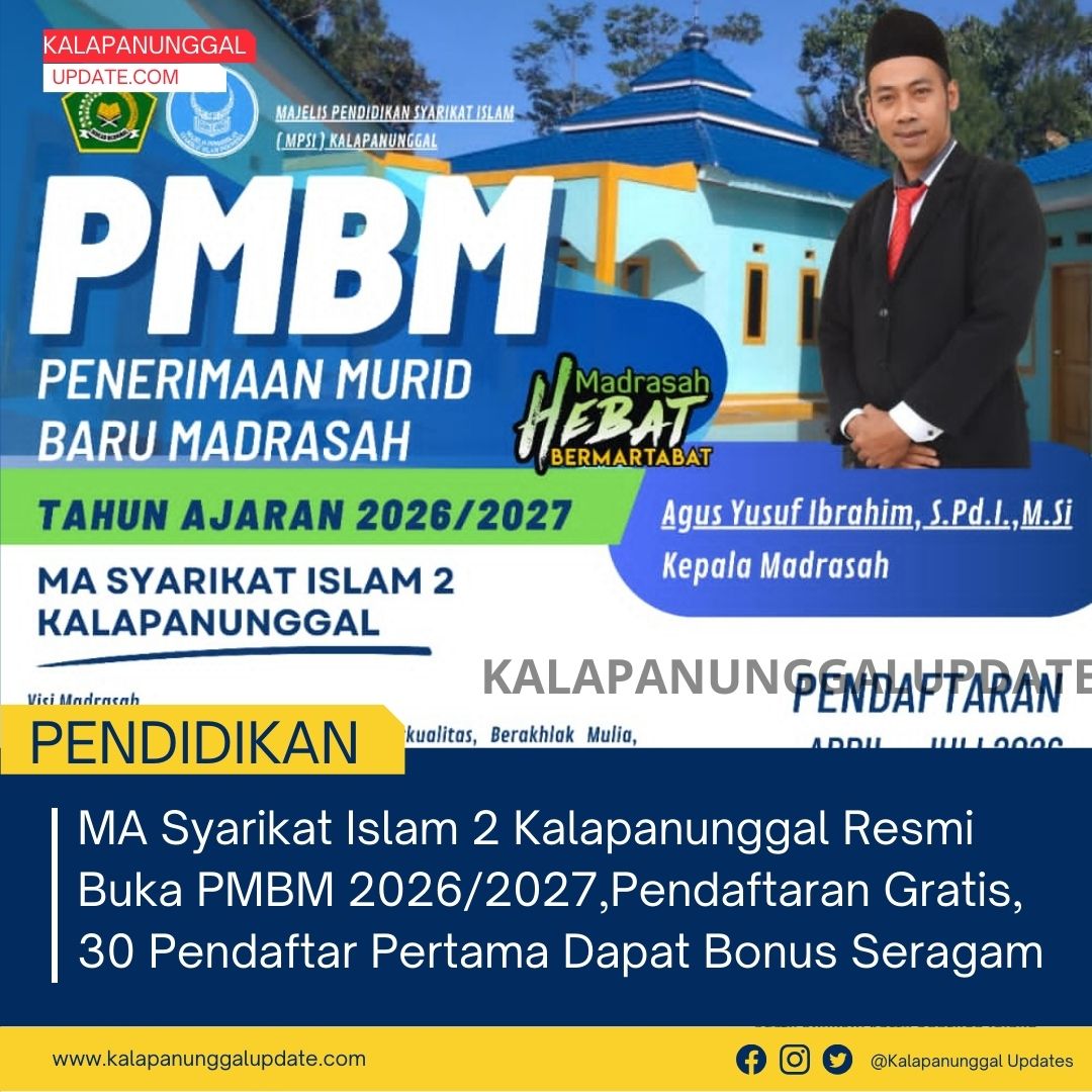 KALAPANUNGGALUPDATE.COM, MA SI 2, Kecamatan Kalapanunggal. – (22/1/2026 ). Kabar baik bagi masyarakat Kecamatan Kalapanunggal dan sekitarnya. Madrasah Aliyah (MA) Syarikat Islam 2 Kalapanunggal resmi membuka Penerimaan Murid Baru Madrasah (PMBM) Tahun Ajaran 2026/2027. Menariknya, pendaftaran dibuka tanpa dipungut biaya dan disertai bonus kaos olahraga serta jas almamater gratis bagi 30 pendaftar pertama.