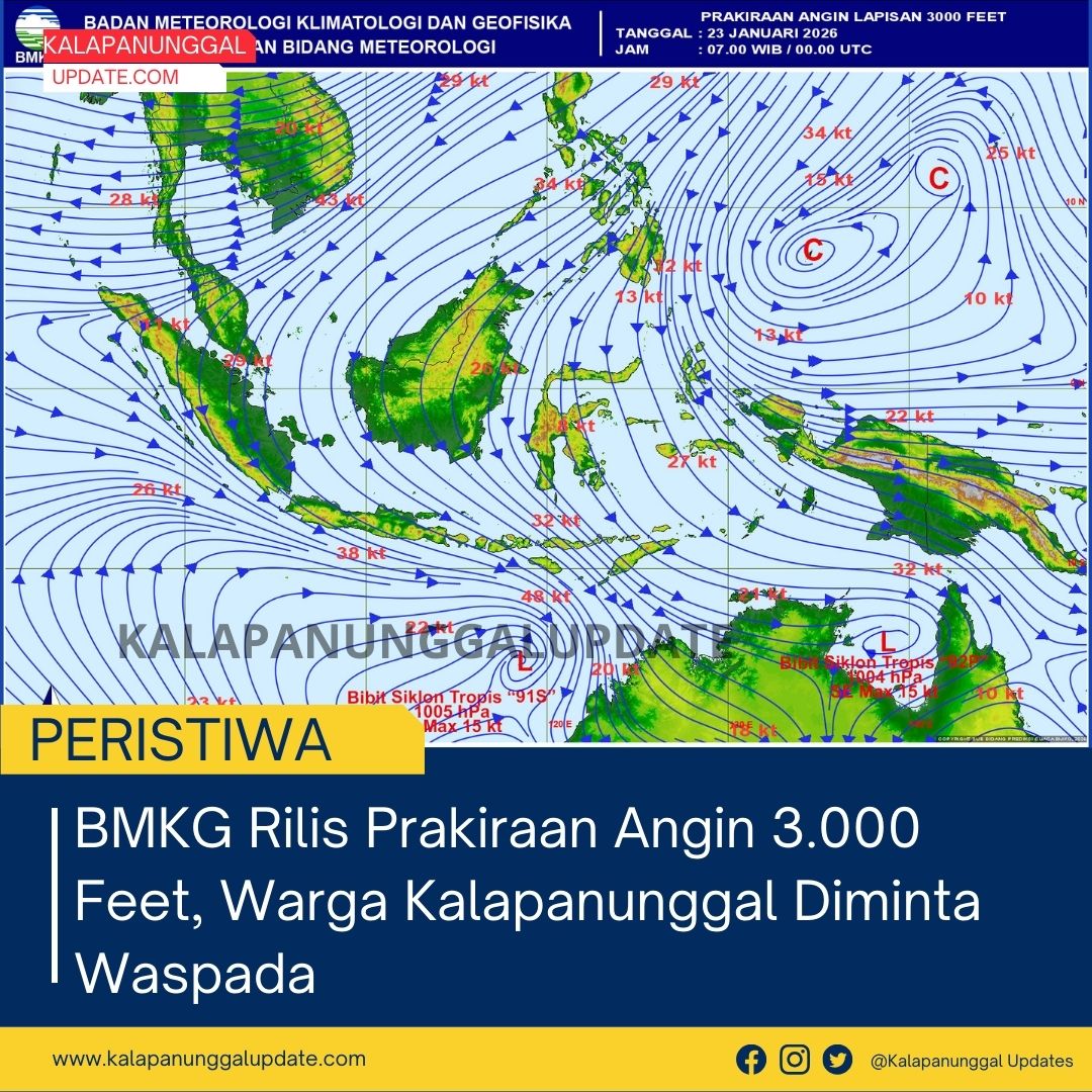 KALAPANUNGGALUPDATE.COM, Kecamatan Kalapanunggal. – ( 23/1/2026 ). Badan Meteorologi, Klimatologi, dan Geofisika (BMKG) melalui prakiraan angin lapisan 3.000 feet memprediksi adanya potensi peningkatan kecepatan dan hembusan angin di sejumlah wilayah Jawa Barat, termasuk Kecamatan Kalapanunggal, Kabupaten Sukabumi, mulai hari ini, Jumat (23/1/2026) hingga lima hari ke depan.