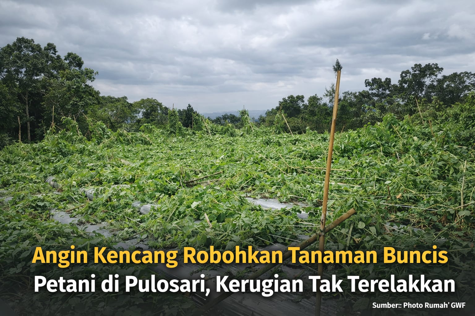 Berdasarkan pantauan di lokasi, terlihat tanaman buncis yang sebelumnya tertata rapi di atas bedengan kini tumbang akibat terpaan angin kuat. Tiang-tiang penyangga yang biasa menopang rambatan tanaman ikut roboh, membuat daun dan batang buncis menutupi hampir seluruh lahan.