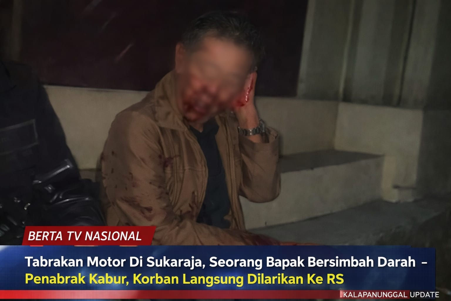 Berdasarkan video yang beredar di media sosial, korban tampak duduk lemas dengan wajah dan tangan berlumuran darah, diduga mengalami luka di bagian kepala dan lengan akibat benturan keras. Kondisi korban membuat warga sekitar panik dan segera memberikan pertolongan seadanya sambil menunggu bantuan.