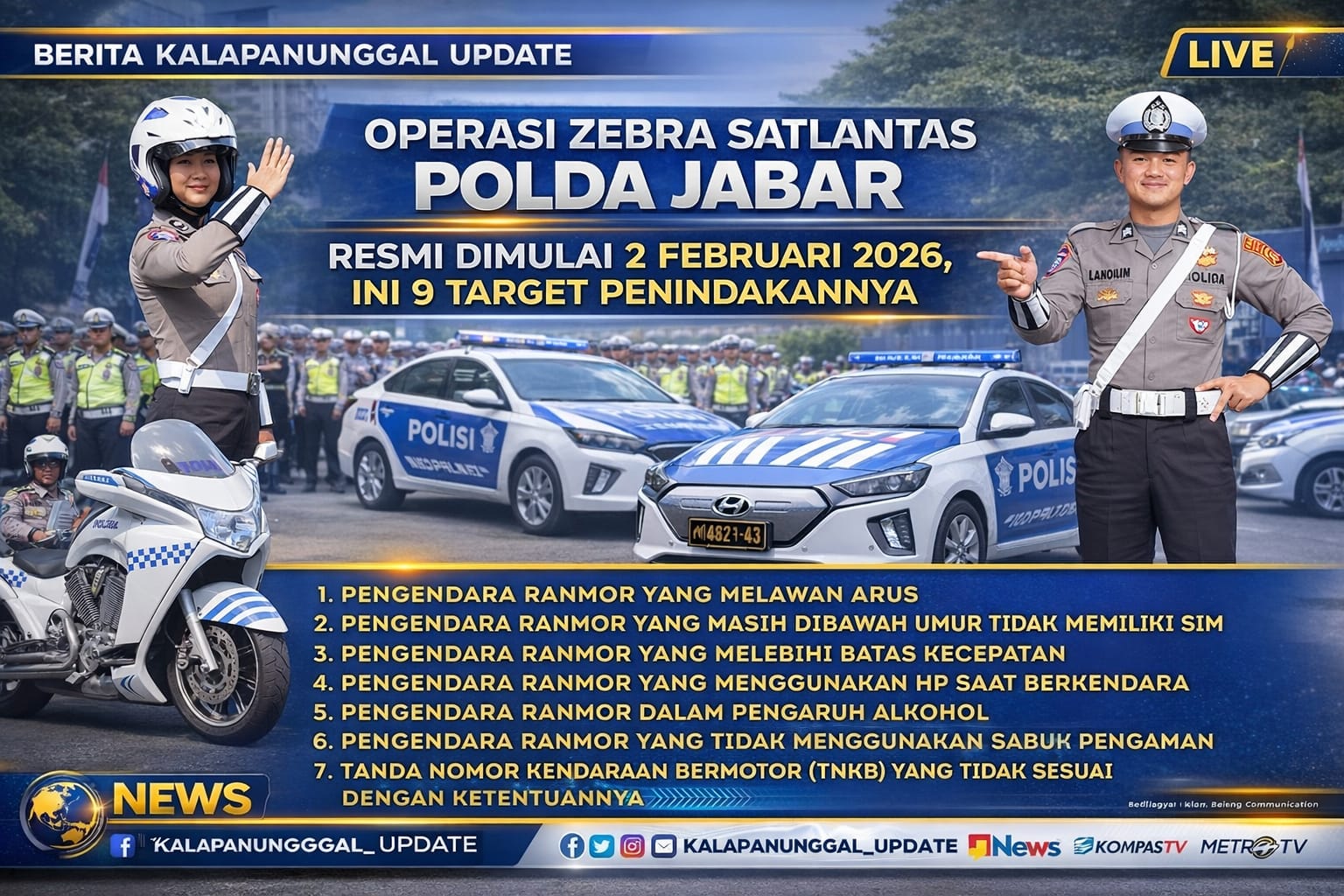 KALAPANUNGGALUPDATE.COM | JAWA BARAT. — ( 2/2/2026 ).Kepolisian Daerah Jawa Barat melalui Direktorat Lalu Lintas resmi menggelar Operasi Zebra Satlantas 2026 mulai 2 Februari 2026. Operasi ini digelar secara serentak di seluruh wilayah hukum Polda Jabar sebagai upaya meningkatkan keselamatan, ketertiban, dan kepatuhan masyarakat berlalu lintas.