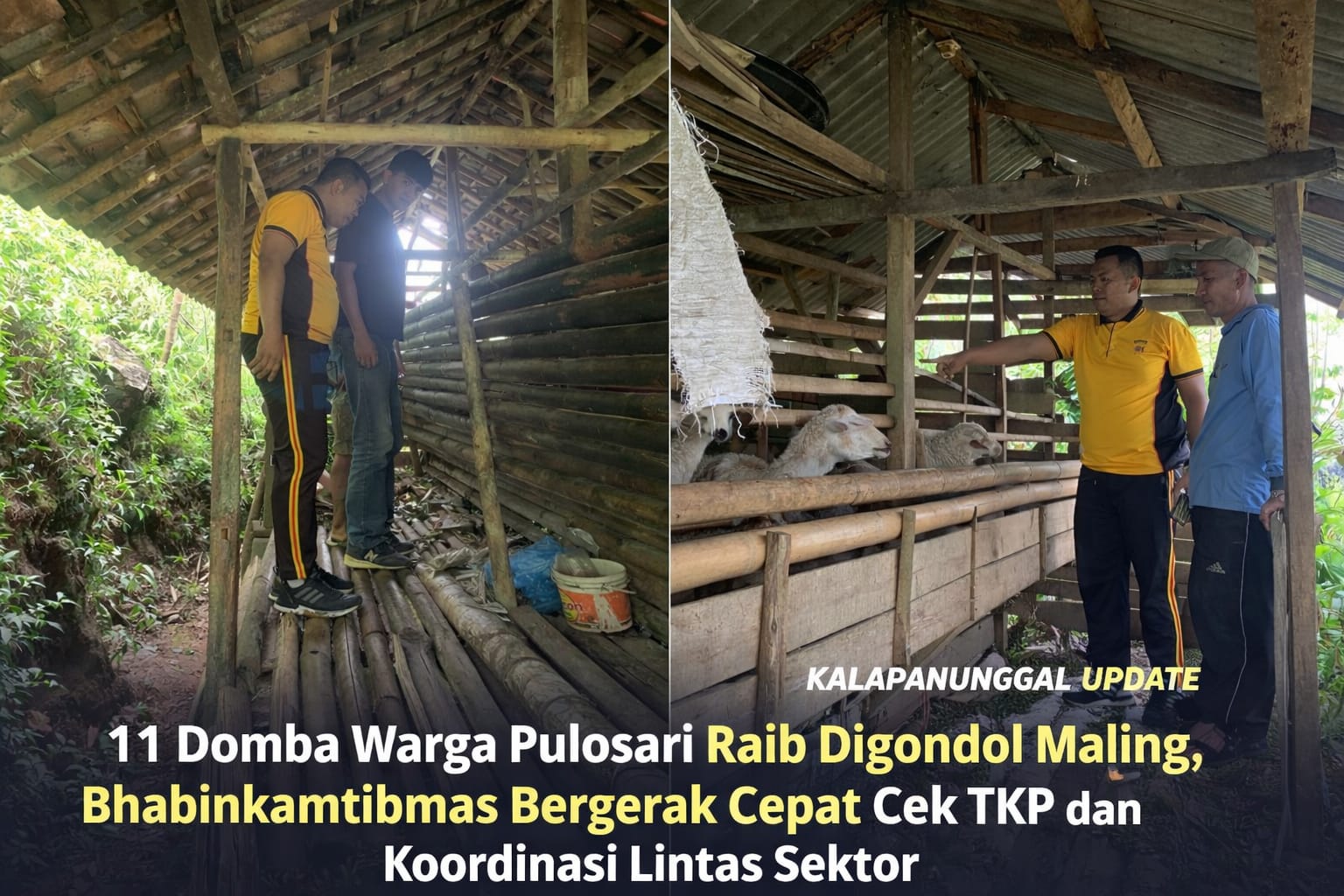 KALAPANUNGGALUPDATE.COM | BHABINKAMTIBMAS PULSORI, Kalapanunggal, – ( 13/2/2026 ). Aksi pencurian ternak kembali meresahkan warga Desa Pulosari, Kecamatan Kalapanunggal. Sebanyak 11 ekor domba milik warga dilaporkan hilang dicuri pada Kamis malam di Kampung Cigoong II dan Kampung Raksamala. Peristiwa tersebut sontak membuat warga khawatir, mengingat ternak merupakan salah satu sumber penghidupan utama masyarakat setempat.