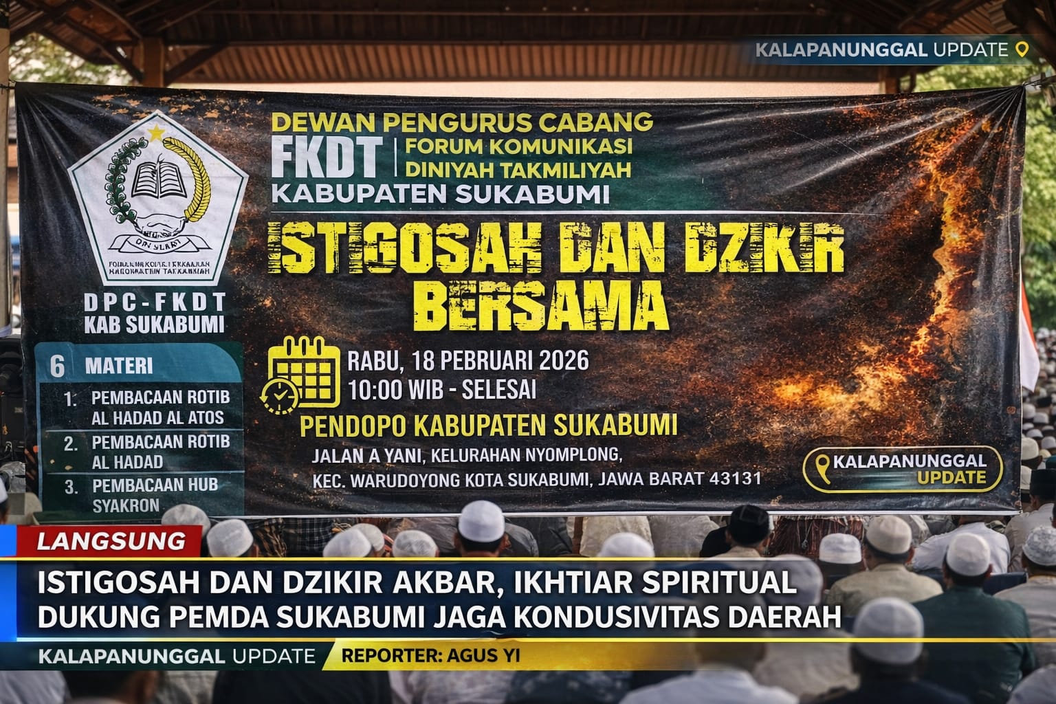 KALAPANUNGGALUPDATE.COM | KABUPATEN SUKABUMI. – ( 17/2/2026 ). Ratusan tokoh agama, guru madrasah diniyah, serta elemen masyarakat dari berbagai wilayah di Kabupaten Sukabumi dijadwalkan menggelar Istigosah dan Dzikir Akbar pada Rabu, 18 Februari 2026. Kegiatan yang akan dipusatkan di Pendopo Kabupaten Sukabumi ini menjadi bentuk dukungan moral dan spiritual kepada Pemerintah Daerah dalam menjaga kondusivitas wilayah di tengah dinamika sosial yang berkembang, termasuk adanya aksi demonstrasi oleh LSM RIB.