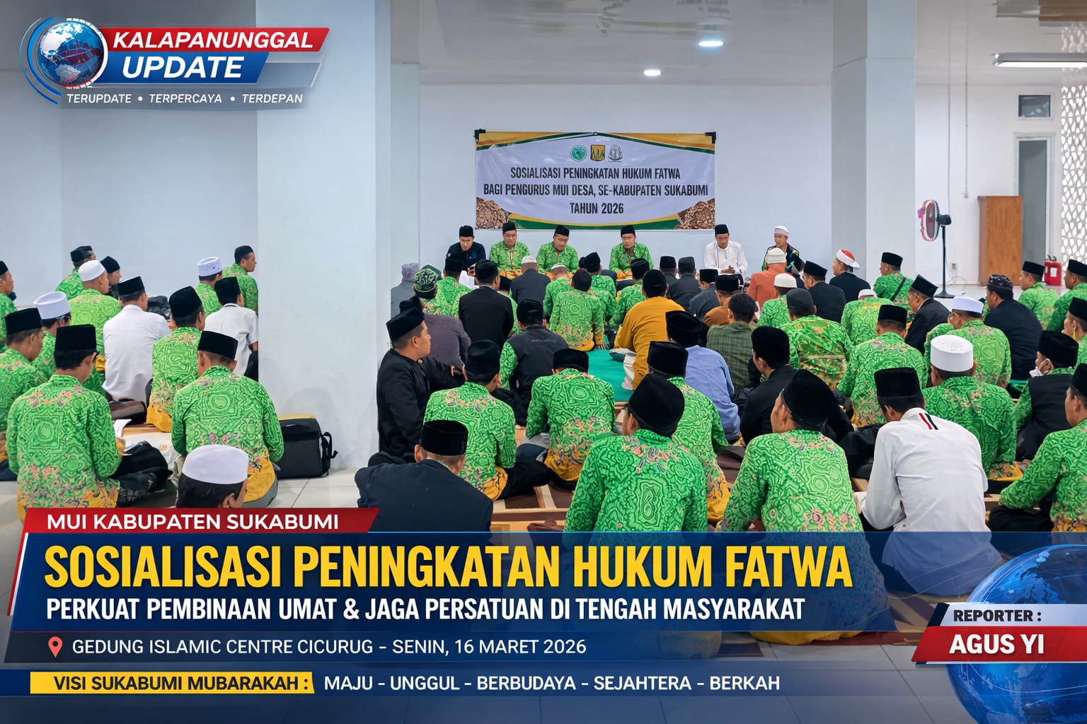 KALAPANUNGGALUPDATE.COM | MUI Kabupaten Sukabumi – ( 16/3/2026 ). Upaya memperkuat pembinaan umat serta menjaga persatuan di tengah masyarakat terus dilakukan oleh Majelis Ulama Indonesia (MUI) Kabupaten Sukabumi. Salah satunya melalui kegiatan Sosialisasi Peningkatan Hukum Fatwa bagi Pengurus MUI Desa se-Kabupaten Sukabumi yang digelar pada Senin (16/3/2026) di Gedung Islamic Centre Cicurug (GICC), Kabupaten Sukabumi.