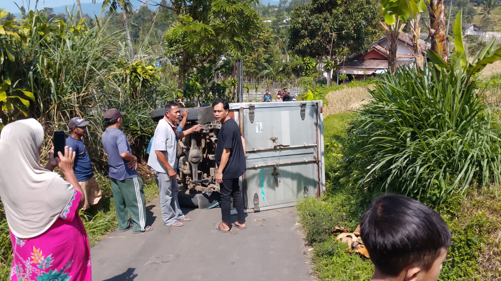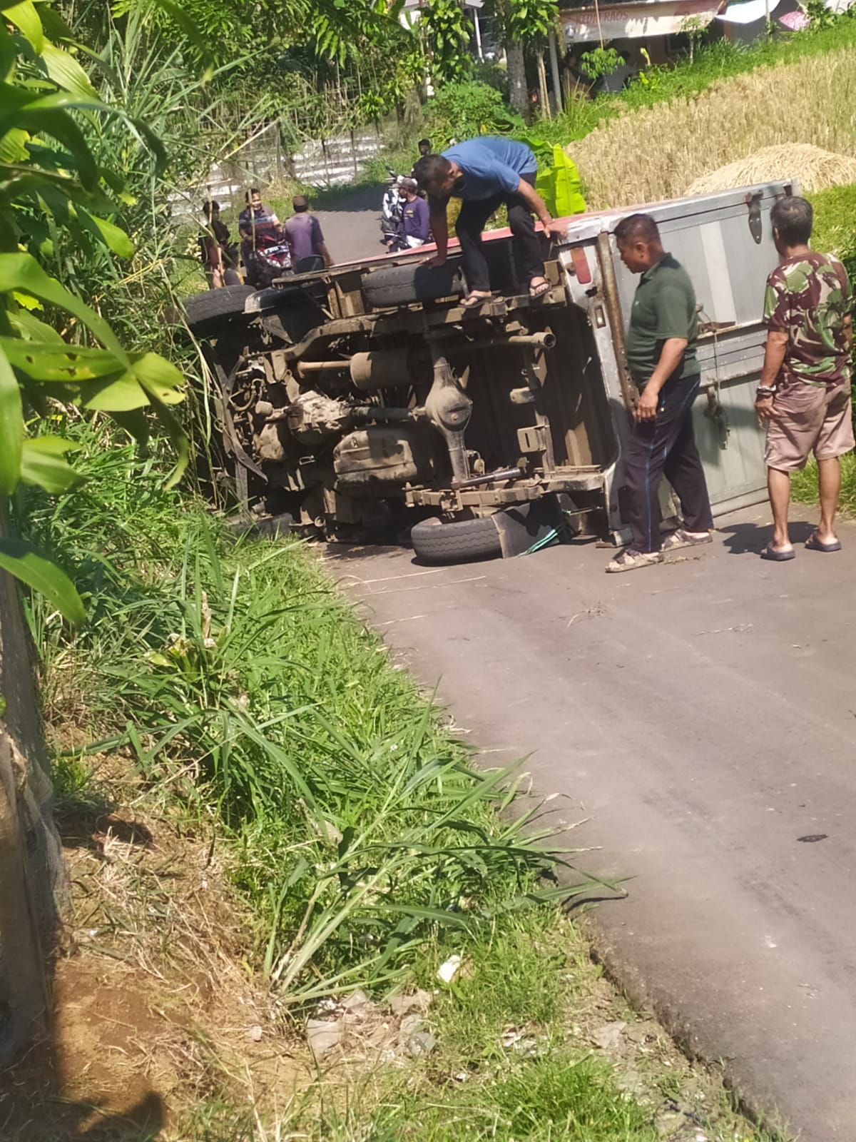 Berdasarkan pantauan di lokasi kejadian, kendaraan tersebut tampak dalam posisi terbalik di tengah jalan sempit yang diapit area persawahan dan pepohonan. Sejumlah warga sekitar langsung berkerumun dan melakukan upaya evakuasi secara gotong royong untuk menyingkirkan kendaraan agar akses jalan kembali normal.