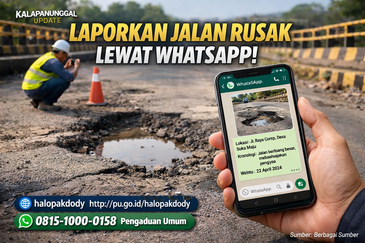 KALAPANUNGGALUPDATE.COM | KEMENTRIAN PEKERJAAN UMUM – ( 17/3/2026 ). Masyarakat kini semakin dimudahkan dalam menyampaikan aduan terkait kondisi jalan nasional maupun jembatan yang mengalami kerusakan. Melalui layanan resmi dari Kementerian Pekerjaan Umum, warga dapat langsung melaporkan kerusakan infrastruktur hanya melalui WhatsApp.