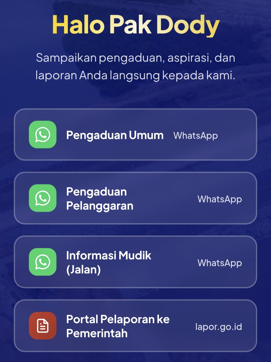 - Atau langsung melalui nomor WhatsApp pengaduan: 0815-1000-0158 (Pengaduan Umum)
