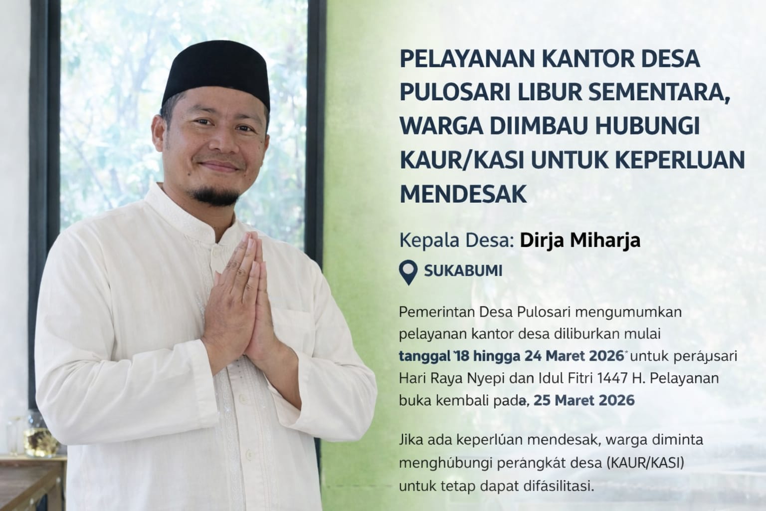 Dalam pengumuman tersebut, pelayanan administrasi di Kantor Desa Pulosari akan diliburkan mulai tanggal 18 hingga 24 Maret 2026. Pelayanan kepada masyarakat akan kembali dibuka pada Rabu, 25 Maret 2026.