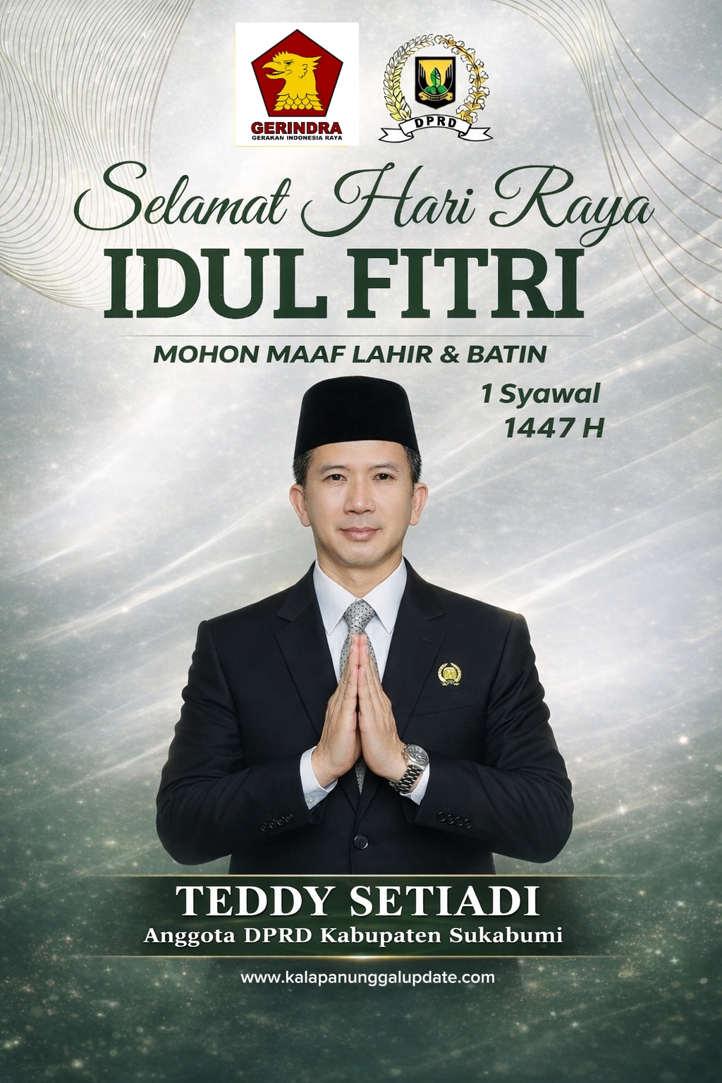 KALAPANUNGGALUPDATE.COM | DPRD Kabupaten Sukabumi – ( 19/3/2026 ). Momentum Hari Raya Idul Fitri 1447 Hijriah dimanfaatkan oleh Anggota DPRD Kabupaten Sukabumi, Teddy Setiadi, untuk menyampaikan pesan penuh kehangatan kepada masyarakat. Melalui sebuah ucapan visual yang elegan dan bernuansa religius, ia mengajak seluruh warga untuk menjadikan Idul Fitri sebagai ajang mempererat tali silaturahmi.