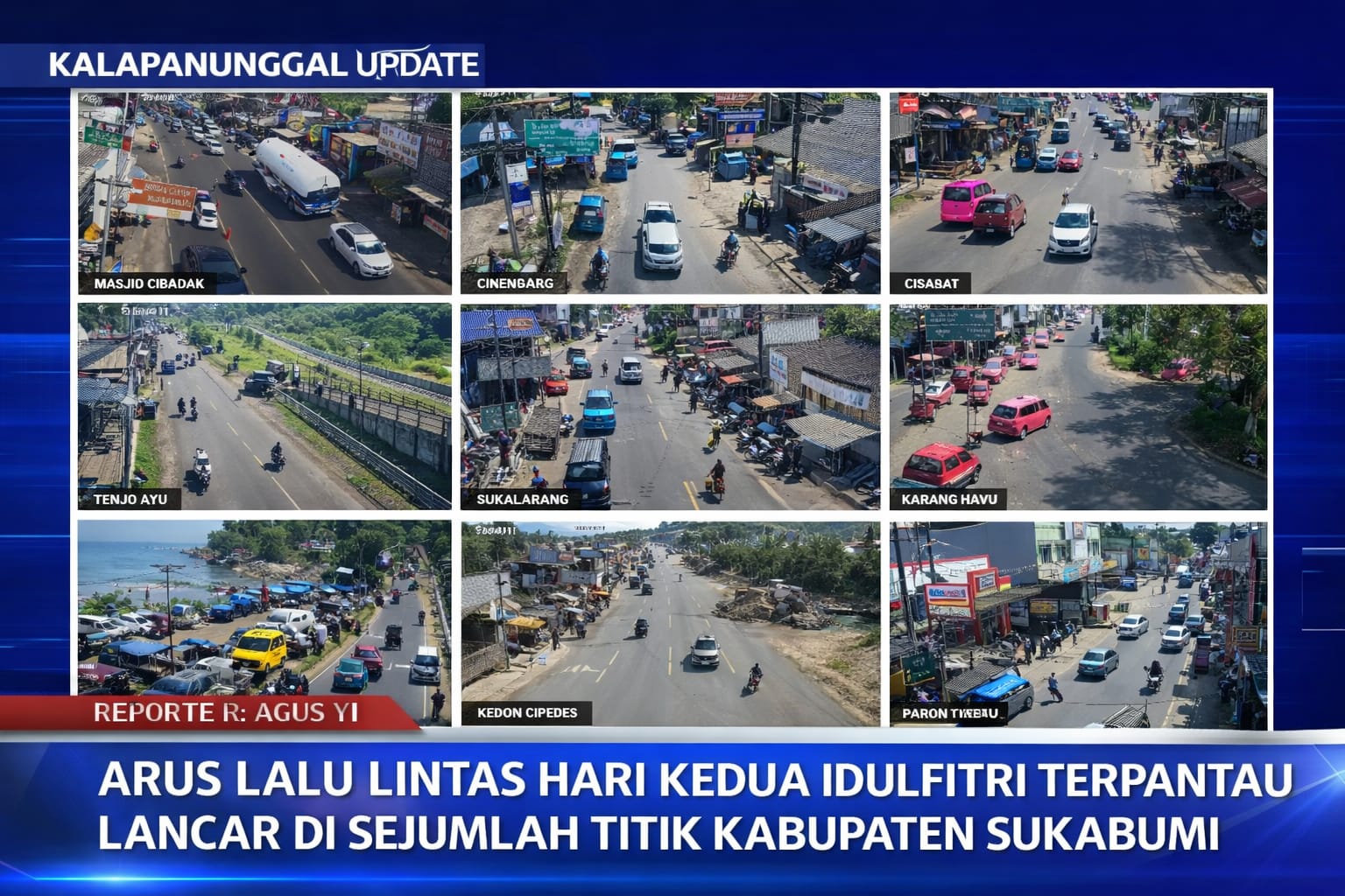 KALAPANUNGGALUPDATE.COM | ARUS LIBUR LEBARAN KABUPATEN SUKABUMI — ( 22/3/2026 ). Memasuki hari kedua Idulfitri, kondisi arus lalu lintas di wilayah Kabupaten Sukabumi terpantau relatif lancar dan kondusif. Hal ini berdasarkan pantauan dari jaringan kamera pengawas (CCTV) milik Dinas Perhubungan Kabupaten Sukabumi yang tersebar di sejumlah titik strategis.