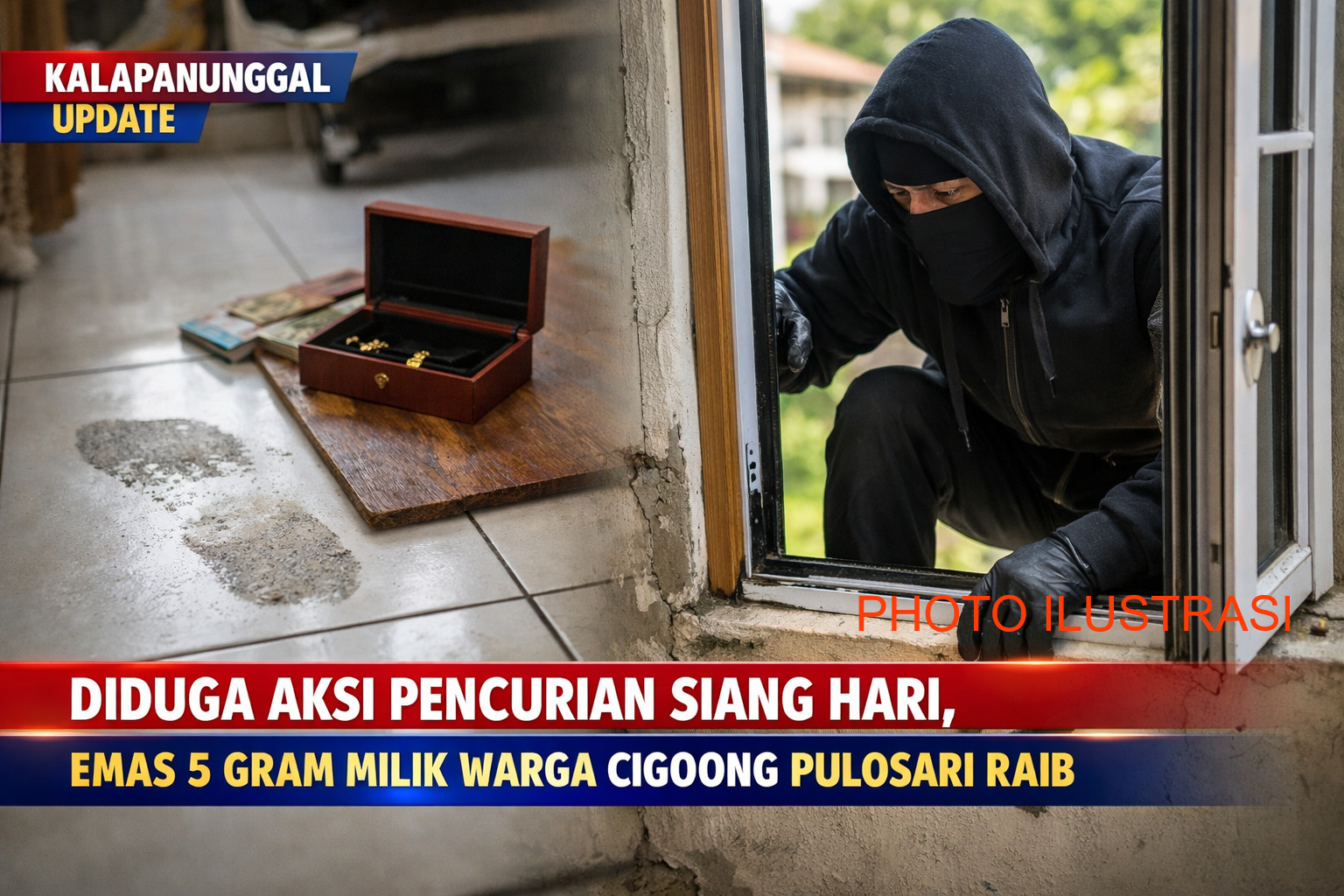 Peristiwa ini terjadi saat kondisi rumah sedang dalam keadaan sepi, sehingga pelaku leluasa menjalankan aksinya tanpa diketahui oleh pemilik rumah maupun warga sekitar.