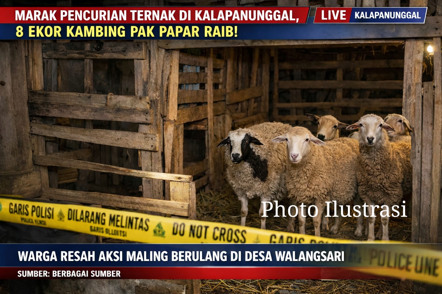 Peristiwa terbaru terjadi di Desa Walangsari, tepatnya di Kampung Tenjolaut, RT 04 RW 02. Insiden yang berlangsung pada malam Kamis itu menyasar ternak milik seorang warga bernama Pak Papar. Sebanyak 8 ekor hewan ternak dilaporkan hilang diduga digondol maling saat kondisi lingkungan tengah sepi.