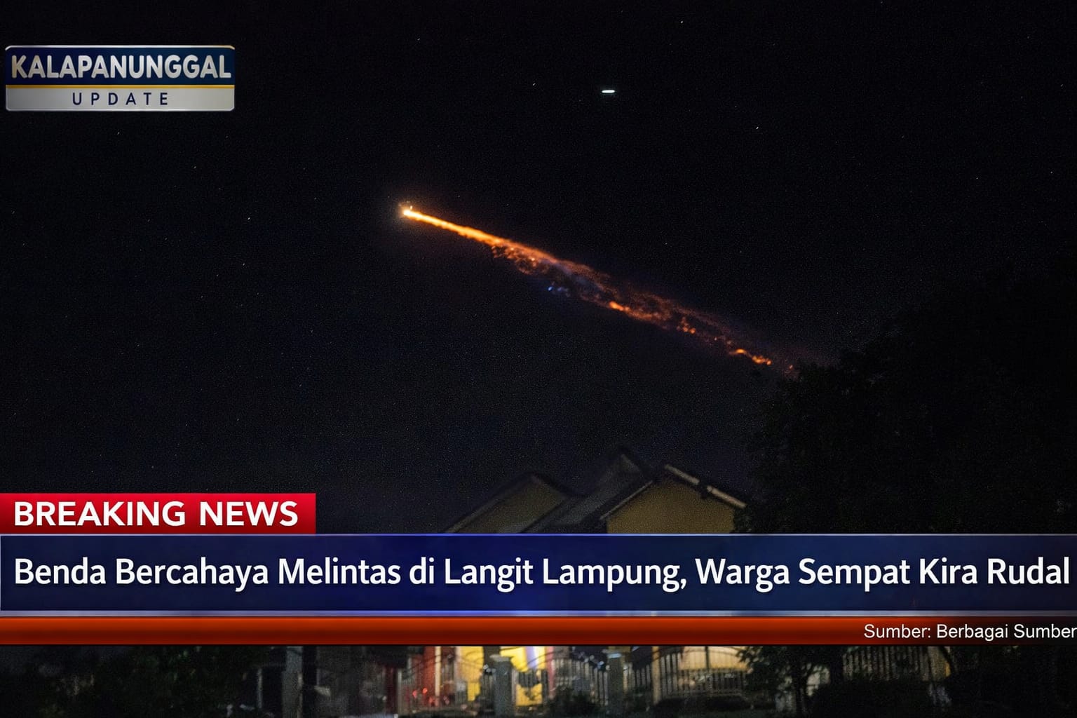 KALAPANUNGGALUPDATE.COM | LAMPUNG – ( 5/4/2026 ). Warga di sejumlah wilayah Indonesia dibuat geger oleh kemunculan sebuah benda bercahaya yang melintas cepat di langit malam, Sabtu malam (4/4/2026). Fenomena langka itu dilaporkan terlihat di berbagai daerah, mulai dari Lampung, Banten, hingga Jawa Barat, dan langsung memicu kepanikan serta spekulasi liar di media sosial.