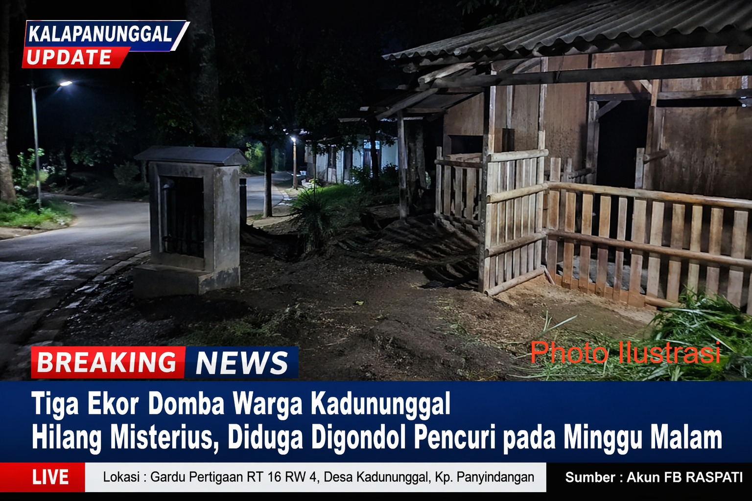 KALAPANUNGGALUPDATE.COM, – ( 13/4/2026 ). Dedsa Kadununggal, Aksi pencurian hewan ternak kembali meresahkan warga. Kali ini, peristiwa tersebut menimpa Budi, warga Kampung Panyindangan, Desa Kadununggal Kecamatan Kalapanunggal, pada Minggu malam (13/4/2026).