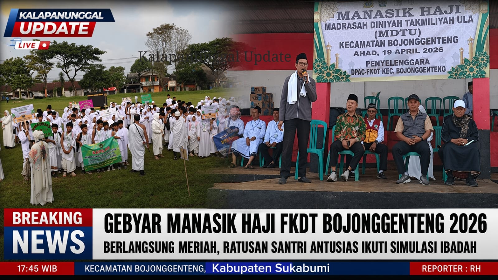 KALAPANUNGGALUPDATE.COM | FKDT Kecamatan Bojong Genteng Kabupaten Sukabumi, – ( 19/4/2026 ). Suasana Lapang Pakuwon, Desa Cibodas, Kecamatan Bojonggenteng, Kabupaten Sukabumi, tampak berbeda pada Ahad (19/04/2026). Ratusan santri Madrasah Diniyah memadati lokasi dalam kegiatan Gebyar Manasik Haji yang diselenggarakan oleh Forum Komunikasi Diniyah Takmiliyah (FKDT) Kecamatan Bojonggenteng.
