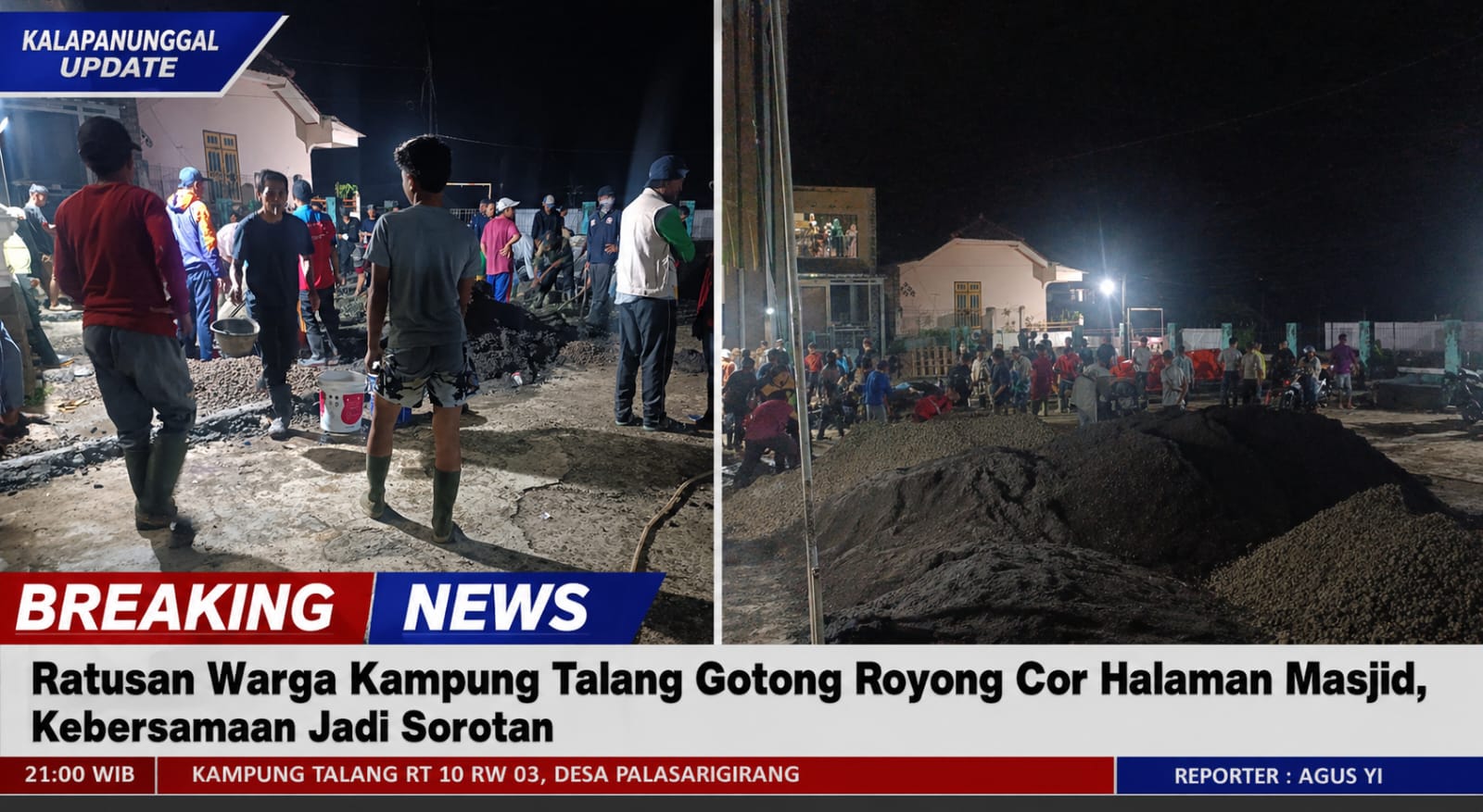 KALAPANUNGGALUPDATE.COM | KAMPUNG TALANG – ( 25/4/2026 ), Semangat kebersamaan dan nilai gotong royong kembali hidup di tengah masyarakat Kampung Talang RT 10 RW 03, Desa Palasarigirang. Ratusan warga tampak kompak bahu-membahu melaksanakan pengecoran halaman Masjid Jami Ussisa Alattaqwa pada Sabtu malam (25/04/2026).