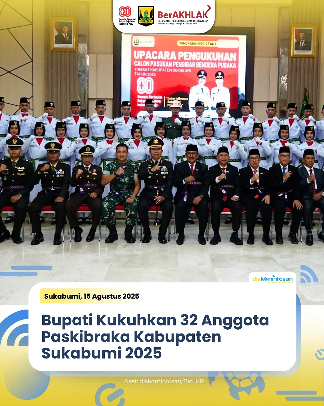 Kalapanunggalupdate. ( 16 Agustus 2025 )-Bupati Sukabumi Asep Japar resmi mengukuhkan 32 anggota Pasukan Pengibar Bendera Pusaka (Paskibraka) Kabupaten Sukabumi tahun 2025 dalam sebuah upacara yang digelar di Aula Sekretariat Daerah, Jumat (15/8/2025). Mereka adalah putra-putri terbaik daerah yang terpilih melalui proses seleksi ketat untuk melaksanakan tugas mulia mengibarkan dan menurunkan bendera Merah Putih pada peringatan HUT ke-80 Republik Indonesia.