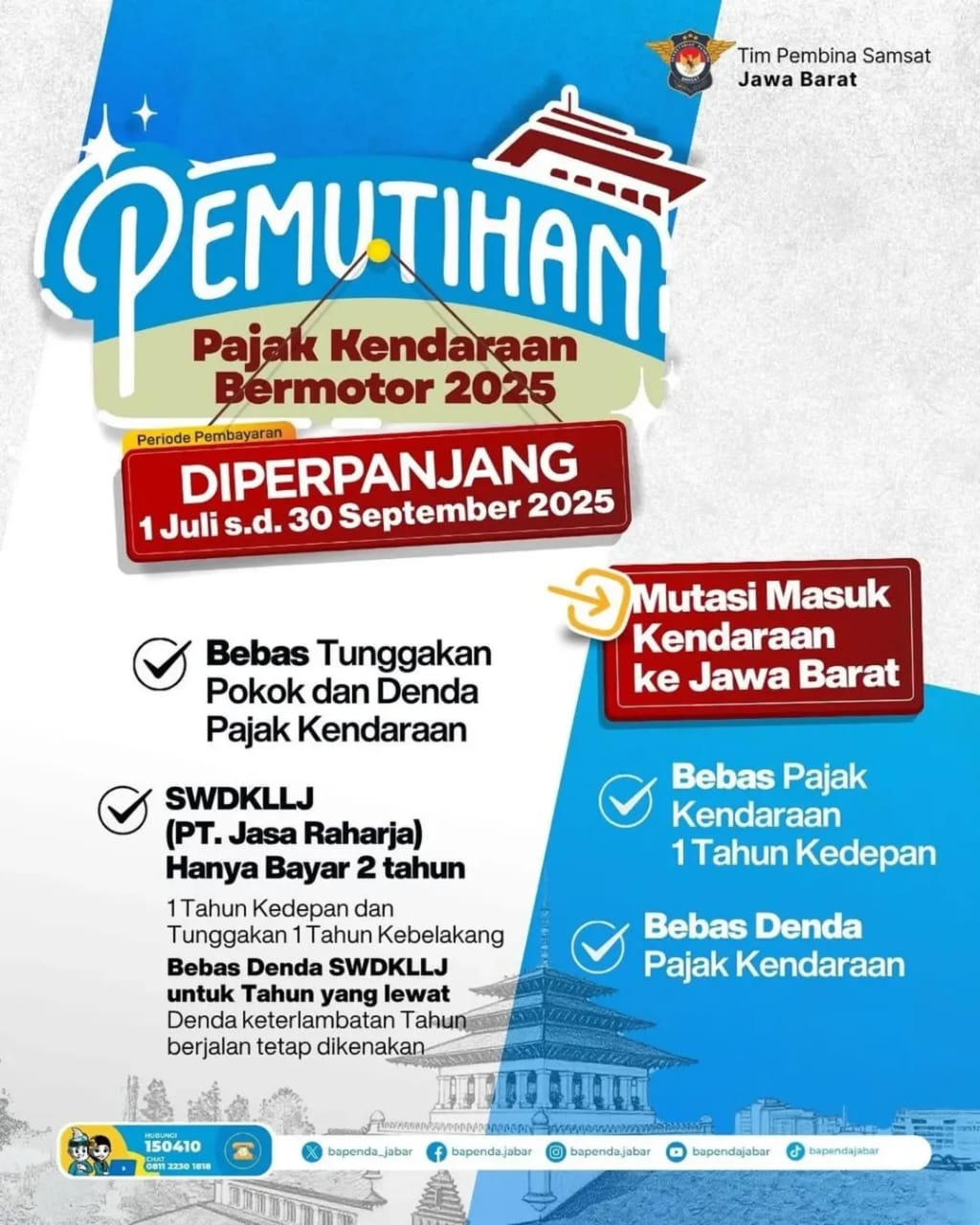 Kalapanunggalupdate – ( 18 Agustus 2025 ), Dalam rangka memberikan keringanan kepada masyarakat, Pemerintah Provinsi Jawa Barat melalui Badan Pendapatan Daerah (Bapenda) kembali memperpanjang program Pemutihan Pajak Kendaraan Bermotor (PKB) 2025 hingga 30 September 2025.