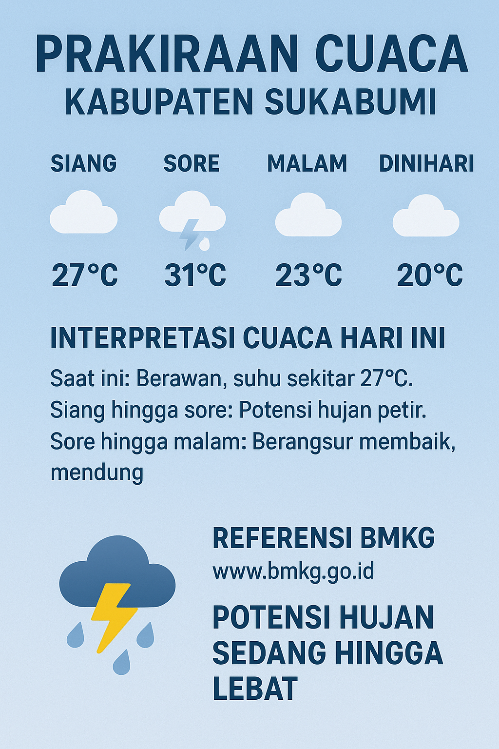 Menurut prakiraan cuaca harian, pagi hingga menjelang siang wilayah Sukabumi diperkirakan berawan dengan suhu udara berkisar 27–31 derajat Celsius. Memasuki siang hingga sore, peluang hujan dengan intensitas sedang hingga lebat meningkat, terutama di wilayah selatan dan tengah Sukabumi, termasuk Palabuhanratu, Simpenan, Cisolok, serta beberapa kecamatan di wilayah perkotaan. Sementara pada malam hingga dini hari, cuaca berangsur membaik, meski masih ada potensi hujan ringan di beberapa titik.