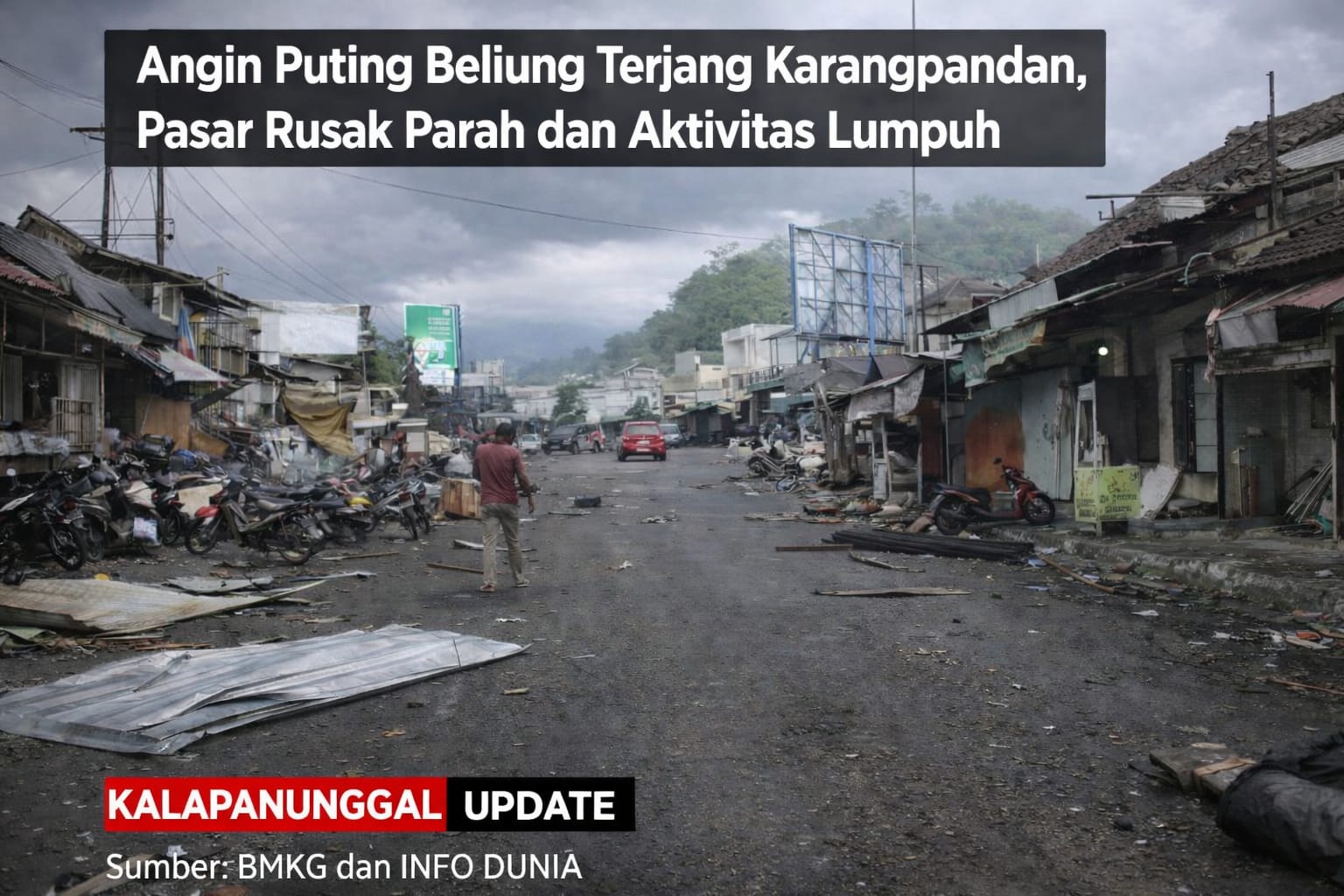 Kondisi paling parah terlihat di area pasar dan terminal Karangpandan. Gerobak pedagang kaki lima yang biasa berjajar rapi tampak berantakan, sebagian terguling hingga menutup badan jalan. Aktivitas jual beli pun lumpuh total, warga berhamburan menyelamatkan diri saat angin berputar disertai hujan deras.