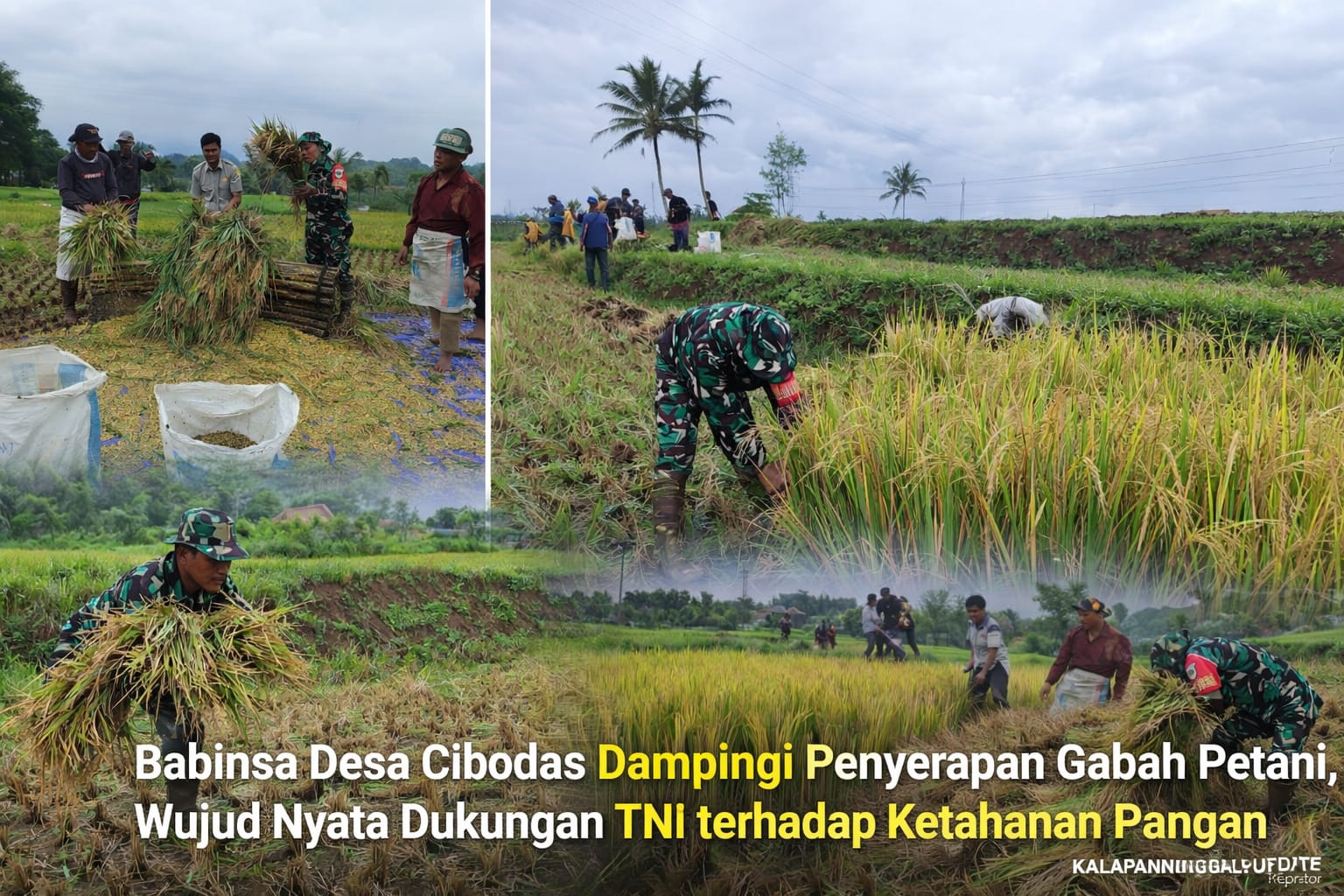 Kegiatan tersebut berlangsung pada Selasa, 10 Februari 2026, mulai pukul 06.00 WIB hingga selesai, dengan melibatkan Babinsa Desa Cibodas, Serda Sugianto, yang secara langsung mendampingi proses panen dan penyerapan gabah milik petani setempat di Kampung Tapos, RT 24/04.
