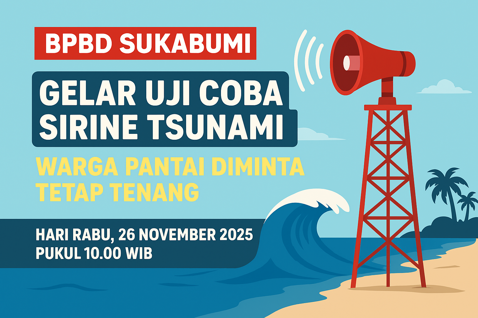 Kalapanunggalupdate.com, Kabupaten Sukabumi, – ( 25/11/2025 ). Badan Penanggulangan Bencana Daerah (BPBD) Kabupaten Sukabumi melalui Pusdalops akan melakukan Test Aktivasi Uji Coba Sirine Tsunami pada Rabu, 26 November 2025 pukul 10.00 WIB. Uji coba ini difokuskan untuk kawasan pesisir Pantai Palabuhanratu, Pantai Simpenan (Loji), serta wilayah sekitarnya.