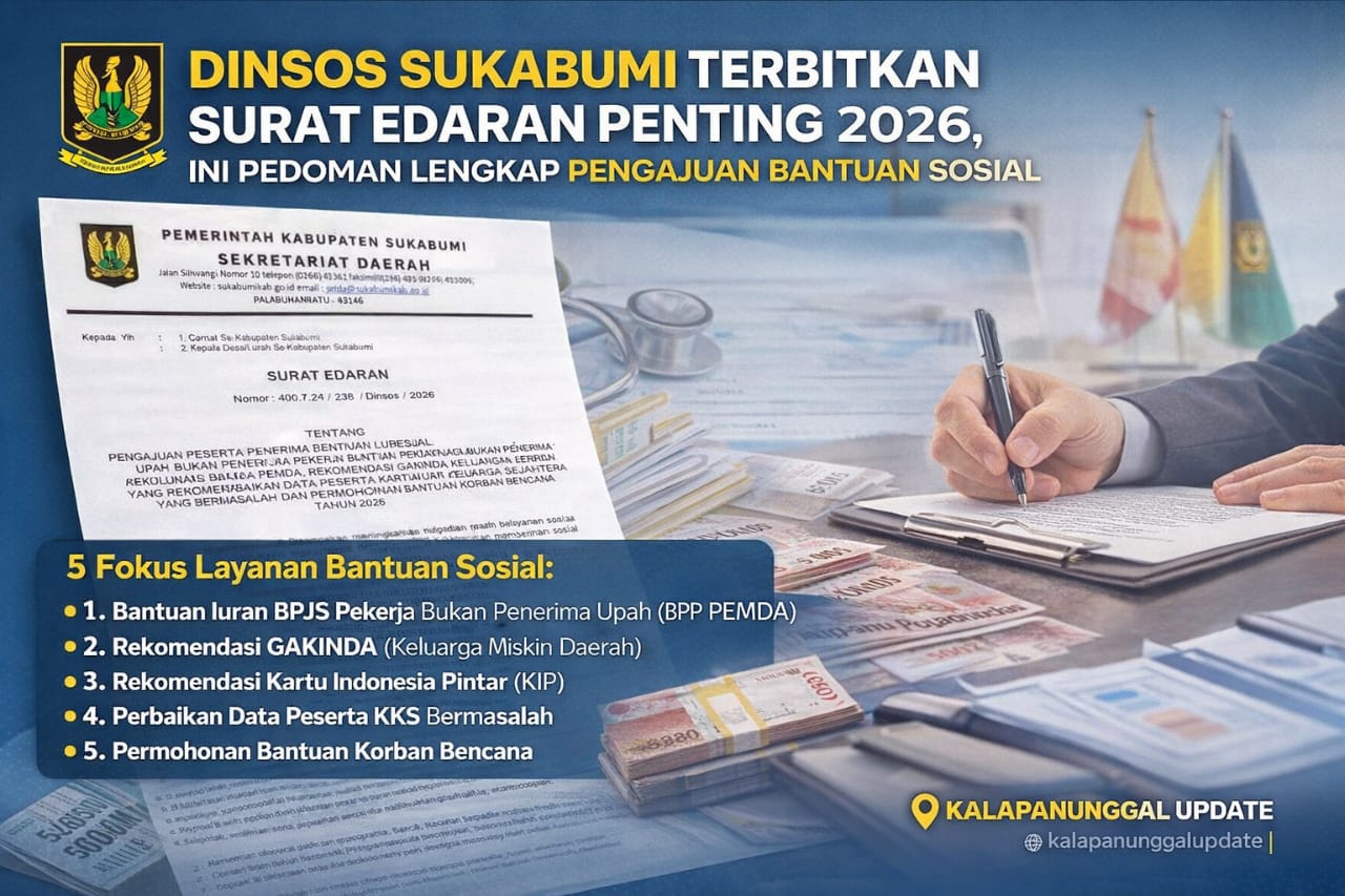 KALAPANUNGGALUPDATE.COM, DINSOS Kabupaten Sukabumi. – ( 9/1/2026 ). Pemerintah Kabupaten Sukabumi melalui Dinas Sosial resmi menerbitkan Surat Edaran Nomor: 400.7.24/238/Dinsos/2026 tentang Pedoman Pelayanan Sosial Tahun 2026. Surat ini menjadi acuan penting bagi seluruh Camat, Kepala Desa, dan Lurah se-Kabupaten Sukabumi dalam proses pengajuan berbagai jenis bantuan sosial bagi masyarakat.