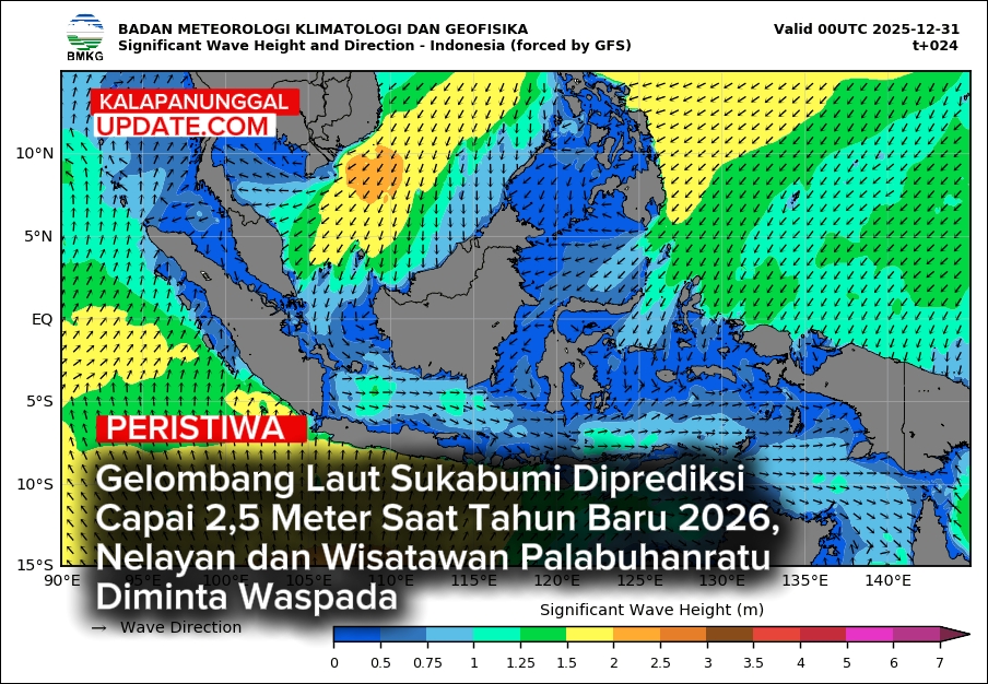 KALAPANUNGGALUPDATE.COM, BMKG, Kabupaten Sukabumi. – ( 31/12/2025 ). Badan Meteorologi, Klimatologi, dan Geofisika (BMKG) mengeluarkan prakiraan gelombang laut yang perlu diwaspadai oleh nelayan serta masyarakat pesisir, khususnya di wilayah perairan selatan Kabupaten Sukabumi, menjelang dan saat perayaan Tahun Baru 2026.