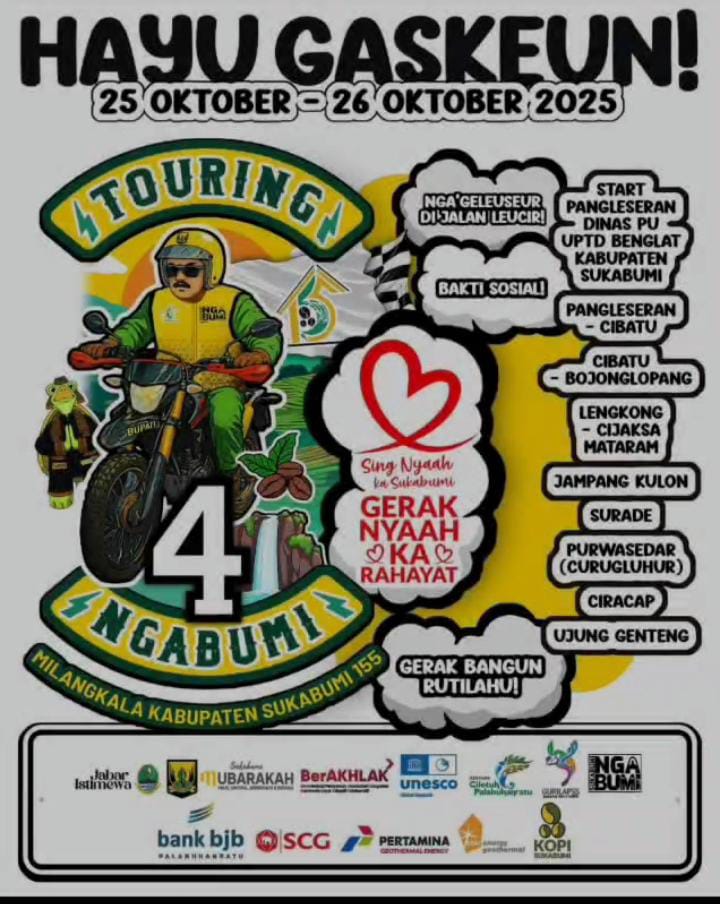 Kalapanunggalupdate.com, Sukabumi, 25–26 Oktober 2025 — Dalam rangka memperingati Milangkala Kabupaten Sukabumi ke-155, Pemerintah Kabupaten Sukabumi kembali menggelar kegiatan Touring Ngabumi 4 dengan semangat “Hayu Gaskeun! Gerak Nyawah ka Rahayat”. Kegiatan ini tidak sekadar ajang touring biasa, melainkan gerakan sosial dan kepedulian nyata kepada masyarakat Sukabumi.