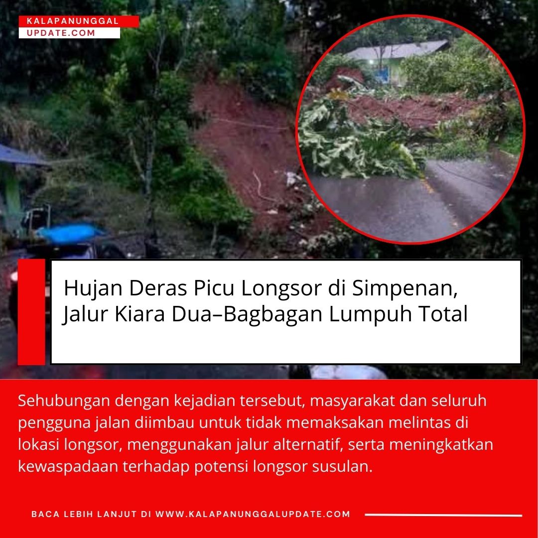 Berdasarkan informasi warga setempat, hujan deras yang mengguyur kawasan tersebut menyebabkan tebing di sekitar badan jalan tidak mampu menahan beban air, sehingga material tanah dan bebatuan longsor menutup akses jalan. Akibatnya, jalur utama Kiara Dua–Bagbagan mengalami lumpuh total, baik untuk kendaraan roda dua maupun roda empat.