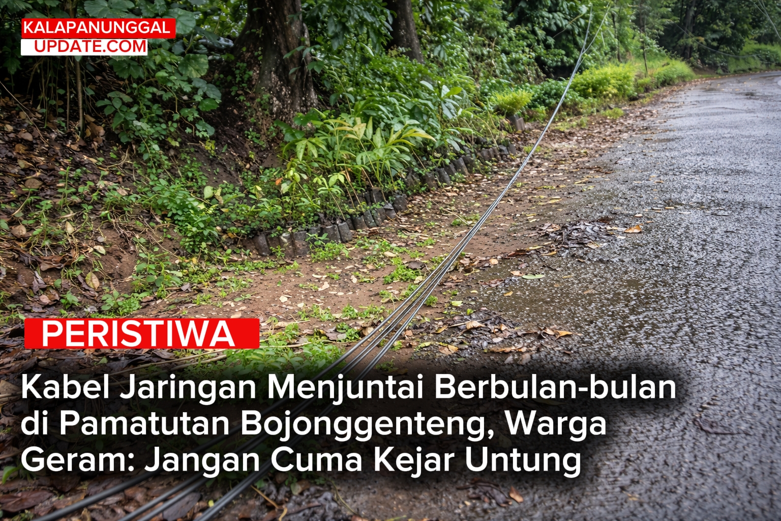 KALAPANUNGGALUPDATE.COM, Bojong Genteng, — ( 29/12/2025 ). Kondisi kabel jaringan telepon dan WiFi yang menjuntai serta melintang di badan jalan di wilayah Pamatutan, Kecamatan Bojonggenteng, menuai keluhan serius dari warga. Pasalnya, kabel tersebut diduga tidak kunjung diperbaiki selama lebih dari empat bulan, sehingga dinilai membahayakan dan mengganggu pengguna jalan.