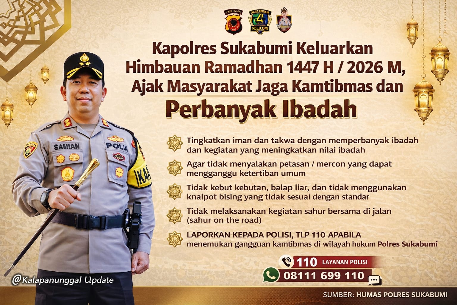 KALAPANUNGGALUPDATE.COM | POLRES SUKABUMI. – ( 27/2/2026 ). Dalam rangka menyambut Bulan Suci Ramadhan 1447 Hijriah/2026 Masehi, Kapolres Sukabumi AKBP Dr. Samian, S.H., S.I.K., M.Si mengeluarkan himbauan resmi kepada seluruh masyarakat Kabupaten Sukabumi agar bersama-sama menjaga keamanan dan ketertiban masyarakat (kamtibmas) selama bulan penuh berkah ini.