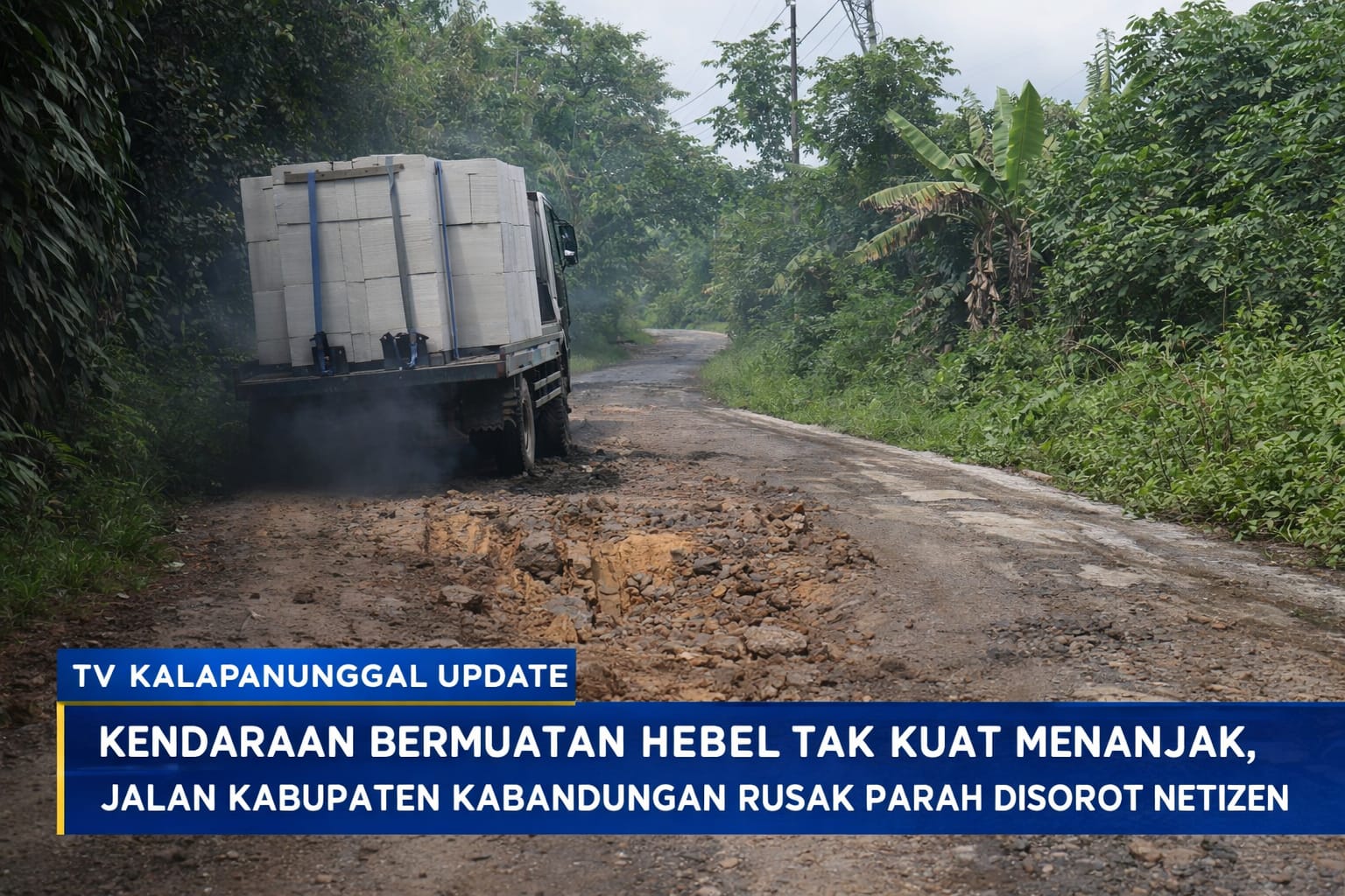 KALAPANUNGGALUPDATE.COM | KABANDUNGAN, SUKABUMI. — ( 5/2/2026 ). Sebuah kendaraan roda empat bermuatan material bangunan jenis hebel tampak tak kuat menanjak saat melintasi jalan kabupaten di Kecamatan Kabandungan, Kabupaten Sukabumi. Kondisi jalan yang rusak parah, berlubang, dan curam membuat kendaraan sempat tersendat, bahkan nyaris tak bisa melanjutkan perjalanan. Peristiwa ini terekam dan viral di media sosial, memicu beragam tanggapan dari warganet.