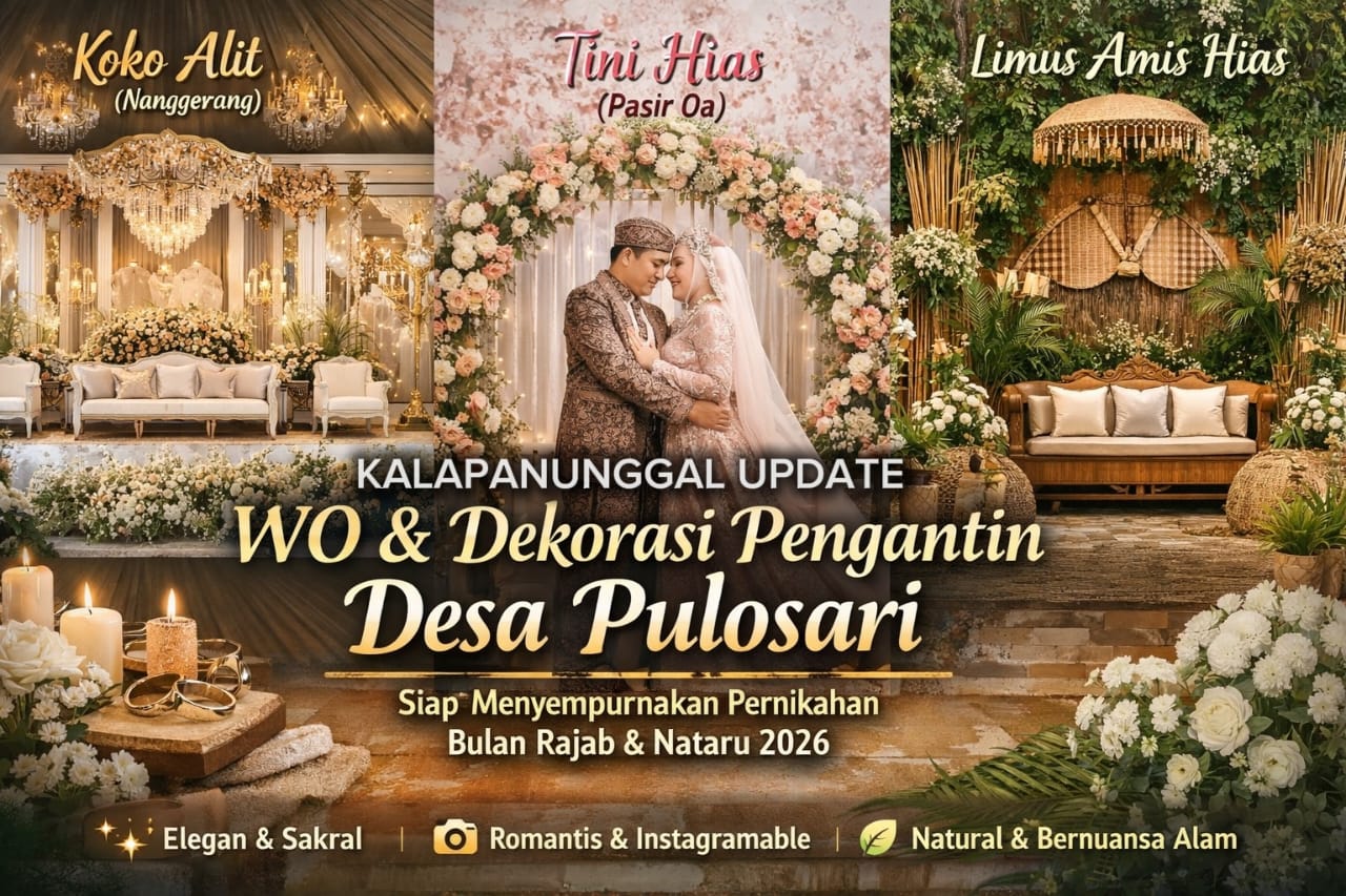 KALAPANUNGGALUPDATE.COM, – ( 27/12/2025 ). Desa Pulosari kini menjadi salah satu rujukan favorit calon pengantin yang menginginkan momen pernikahan berkesan, sakral, dan penuh estetika. Menjelang musim pernikahan Bulan Rajab serta libur panjang Nataru 2026, sejumlah Wedding Organizer (WO) dan jasa dekorasi pengantin lokal tampil dengan konsep kreatif, harga bersahabat, dan kualitas yang tak kalah dengan vendor kota besar.
