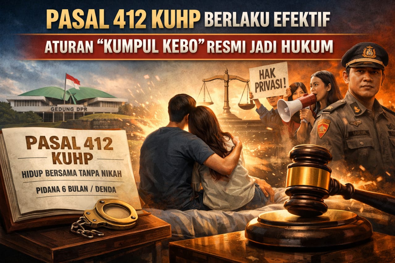 KALAPANUNGGALUPDATE.COM. Jakarta. — ( 3/1/2026 ). Pemberlakuan Kitab Undang-Undang Hukum Pidana (KUHP) Nasional yang mulai efektif pada 2 Januari 2026 menandai babak baru sistem hukum pidana Indonesia. Salah satu pasal yang paling menyita perhatian publik adalah pengaturan mengenai hidup bersama layaknya suami istri tanpa ikatan pernikahan, yang di masyarakat populer disebut sebagai “kumpul kebo”.