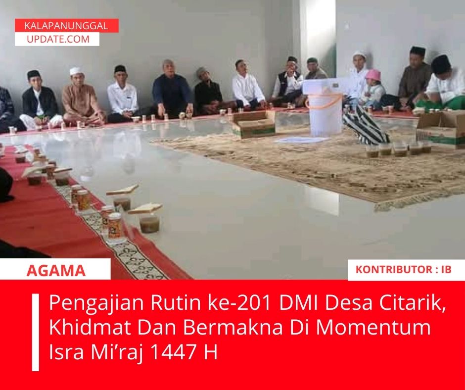 Kalapanunggalupdate.com, Palabuhan Ratu. – ( 22/12/2025 ). Dewan Masjid Indonesia (DMI) Desa Citarik, Kecamatan Palabuhanratu, Kabupaten Sukabumi, kembali menggelar pengajian rutin bulanan yang berlangsung khidmat dan penuh makna. Kegiatan yang dilaksanakan pada Minggu, 21 Desember 2025, bertempat di Aula Desa Citarik, kali ini terasa istimewa karena dirangkaikan dengan peringatan Isra Mi’raj Nabi Muhammad SAW 1447 Hijriah.