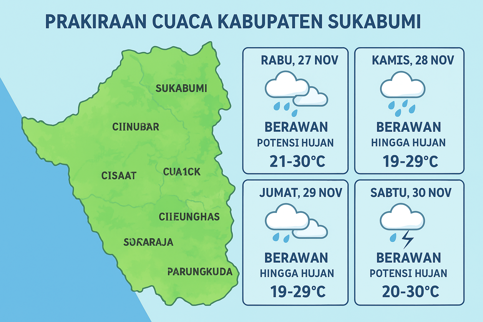Kalapanunggalupdate.com, Kabupaten Sukabumi, — Badan Meteorologi, Klimatologi, dan Geofisika (BMKG) merilis prakiraan cuaca terbaru untuk wilayah Kabupaten Sukabumi, Rabu (27/11/2025), yang menunjukkan bahwa cuaca berpotensi didominasi awan tebal, hujan lokal, hingga hujan sedang disertai petir dalam beberapa hari ke depan. Kondisi ini diperkirakan berlangsung mulai hari ini hingga Sabtu (30/11/2025).